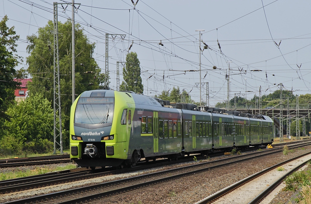 Der sechsteilige Stadler FLIRT 3 (BR 1430) – ET 6.05 der nordbahn (NBE nordbahn Eisenbahngesellschaft mbH & Co. KG) fährt am 16.06.2015, als RB 71 (Wirst – Elmshorn – Pinneberg - Hamburg-Altona), in den Zielbahnhof Hamburg-Altona ein