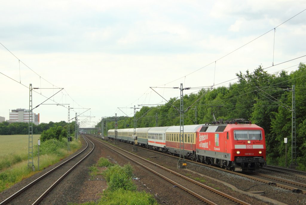 DB Netz 120 501-2  Bahntechnik mit Kompetenz  mit dem IC2417 in Köln-Stammheim am 10.6.2012. Gruß an den Tf !