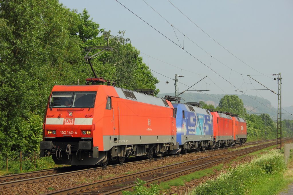 DB 152 143-4 mit 152 138-4 "TFG Albatros Express" + 185 315-9 + Railion 152 098-0 in Limperich am 22.5.2012