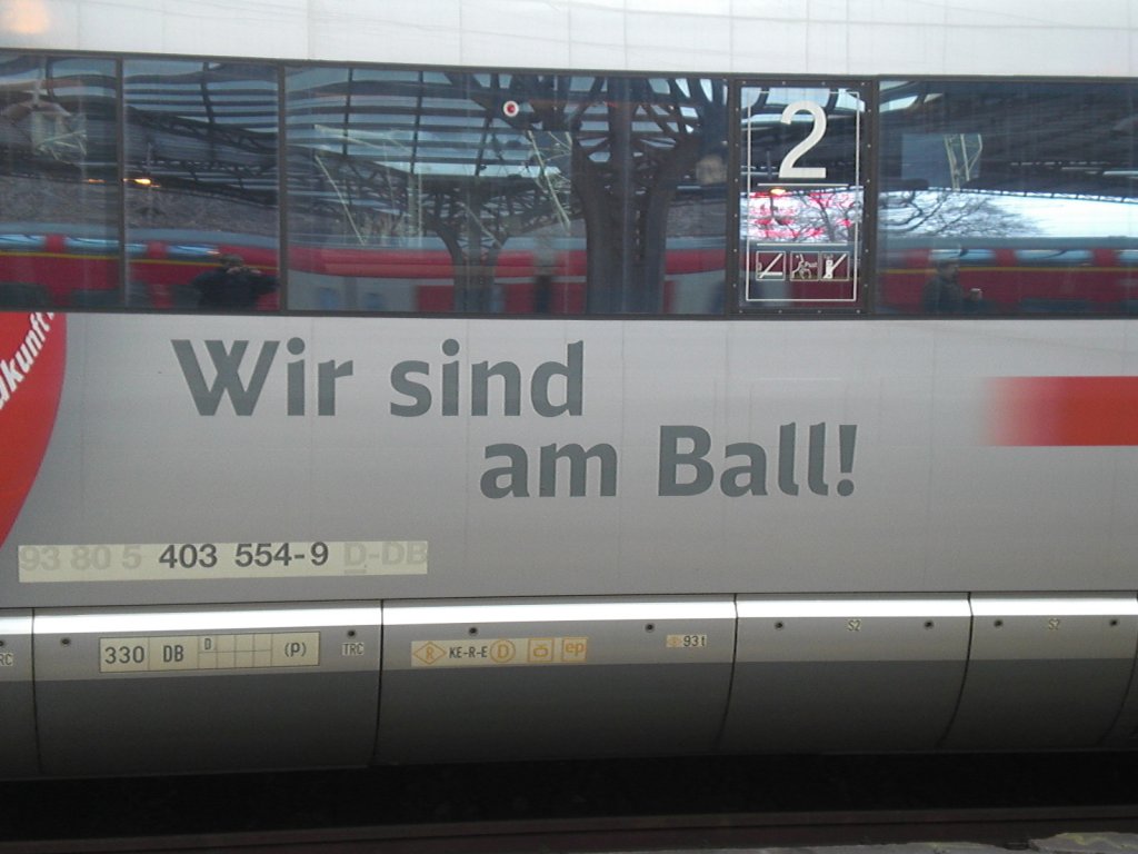 Noch ein Bild von dem Frauenfußball-ICE 403 554-9 in Köln-Hbf am 11.12.2010.