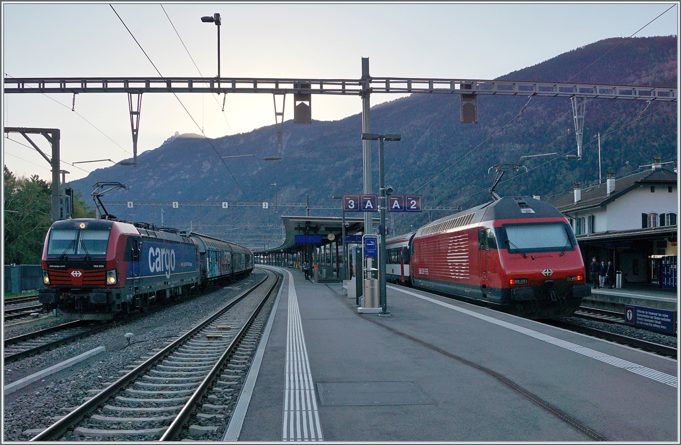 Noch vor Sonnenaufgang zeigen sich in Martingy der Re 460 mit einem IR nach Brig und die von SBB Cargo gemietet 193 059 mit einem Güterzug .