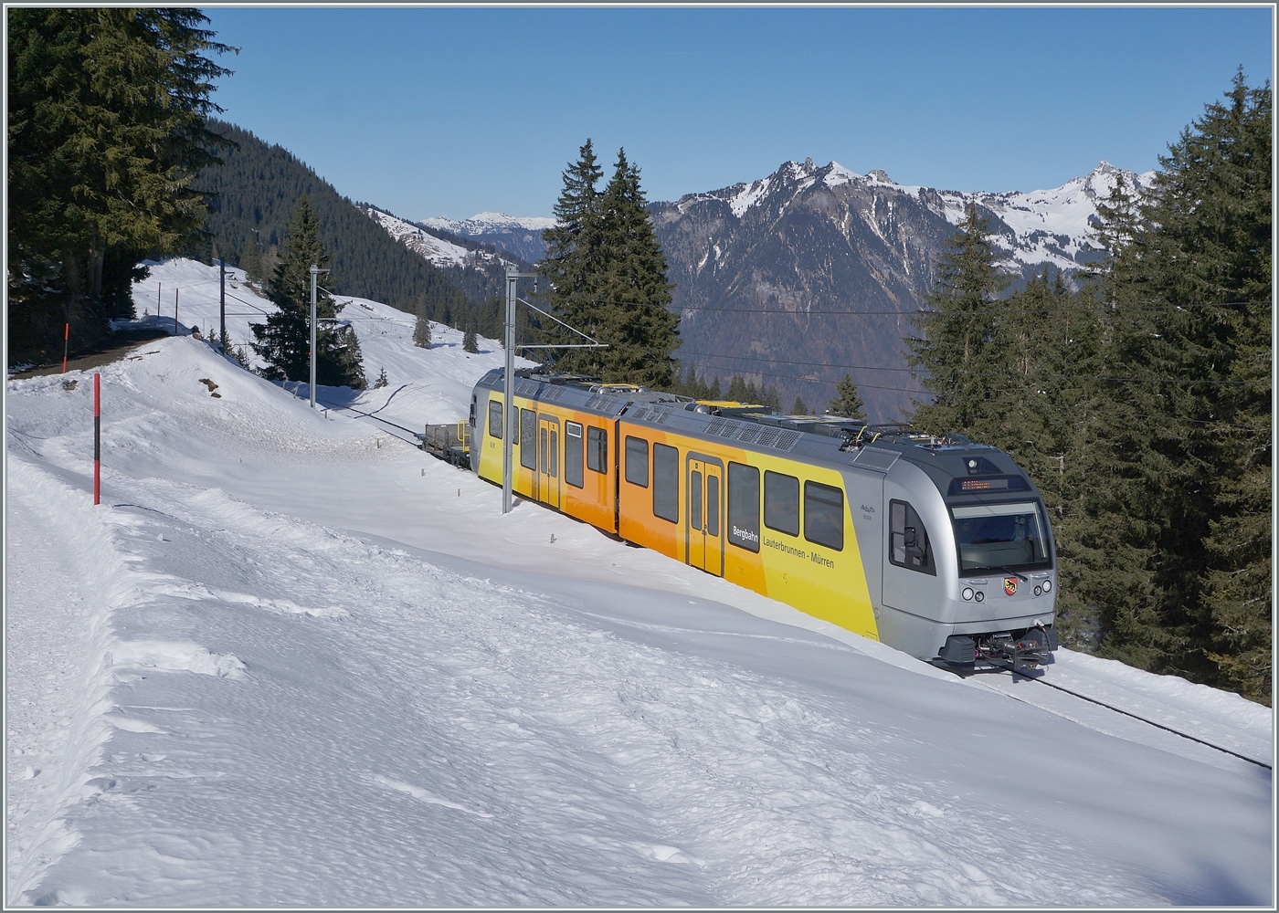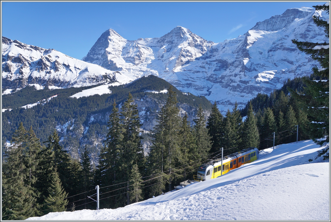 Auch der neue BLM Be 4/6 102 "Mönch" verkehrt mit einem Vorstellewagen, hier kurz nach Mürren.
