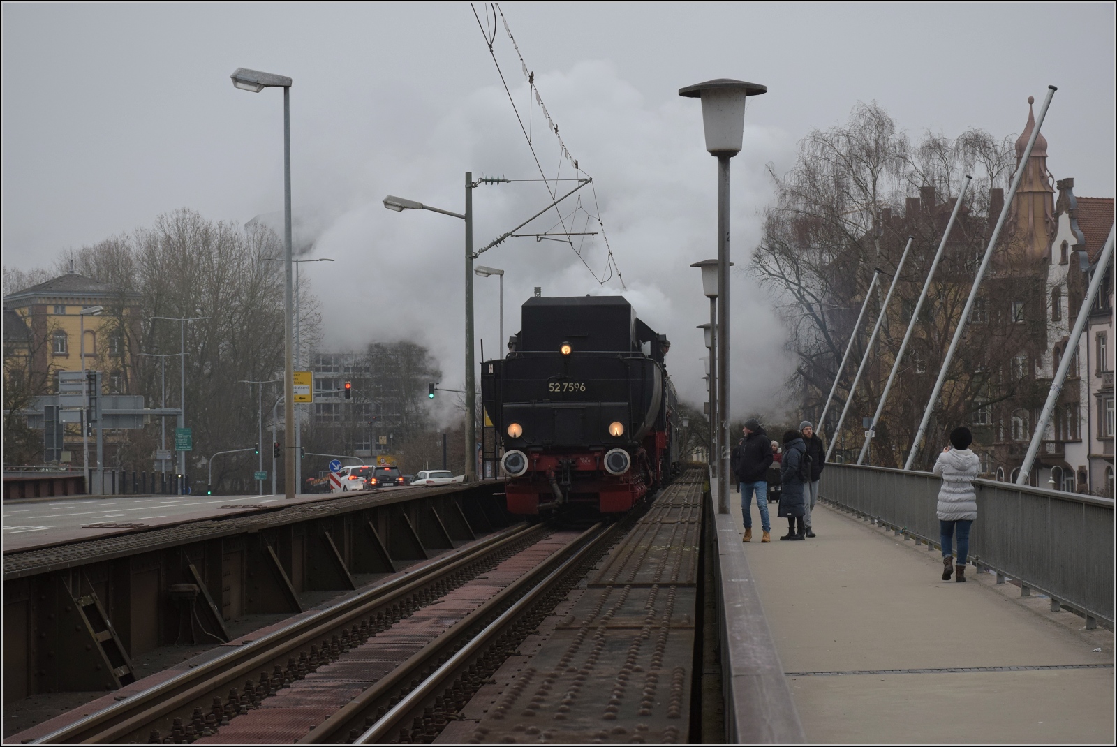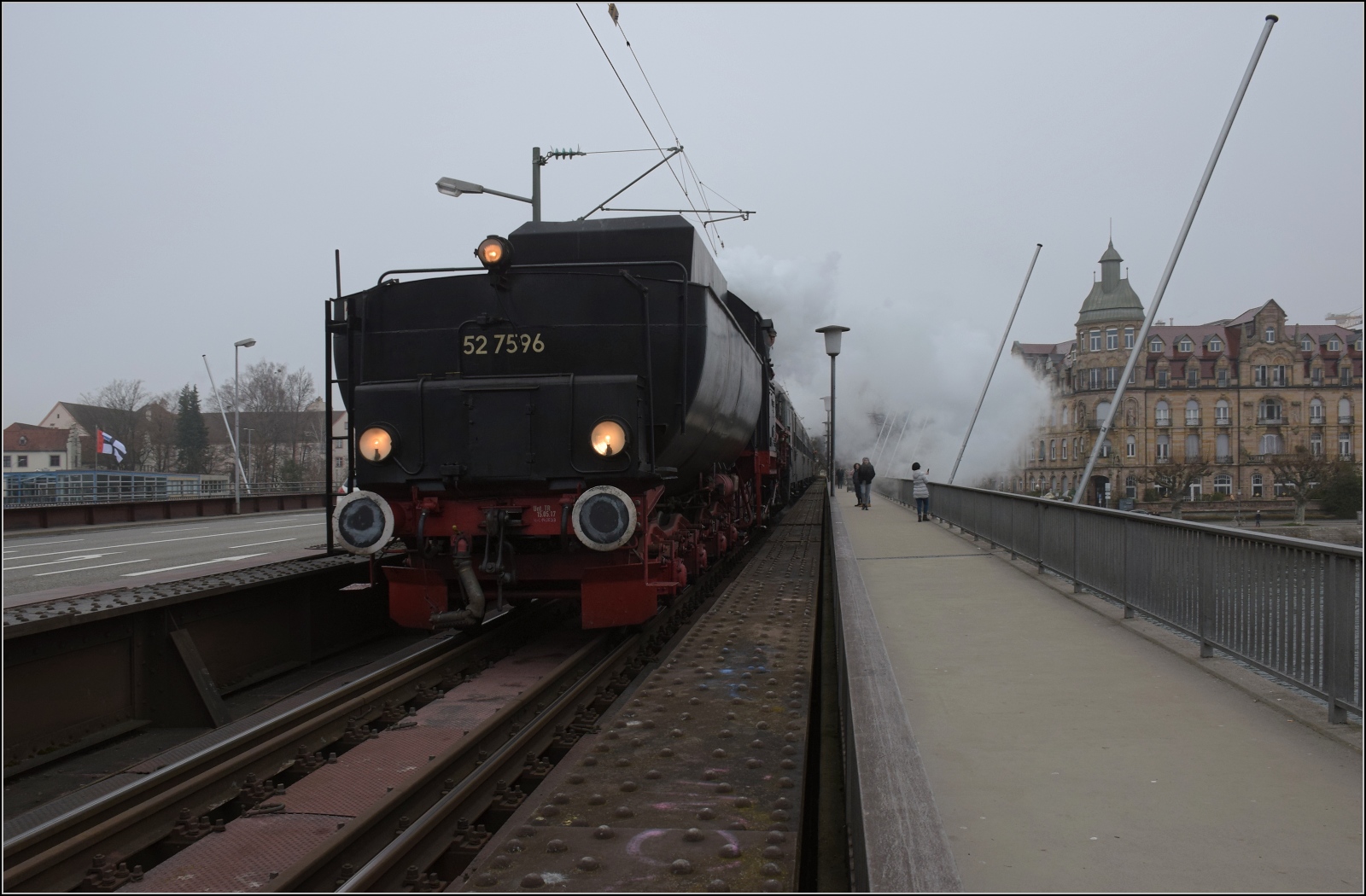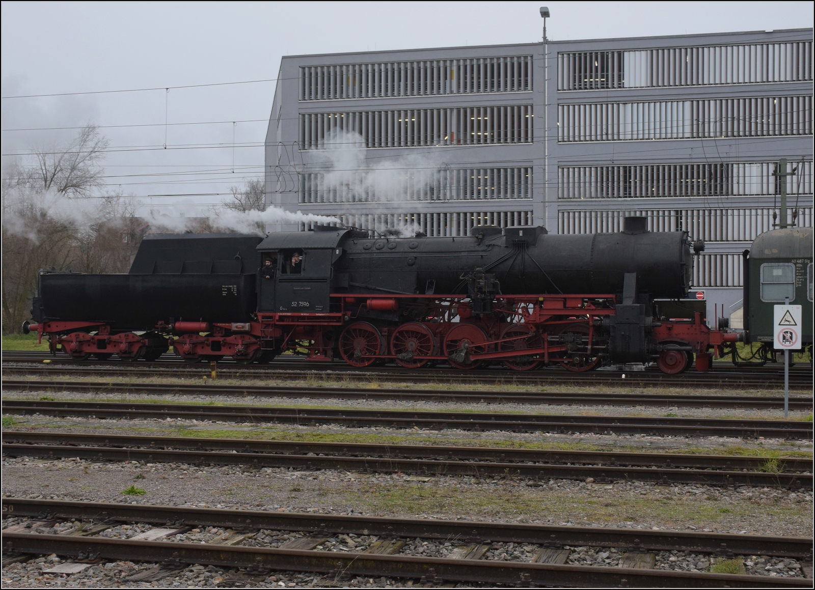 52 7596 mit ihrem EFZ-Sonderzug für die SEHR & RS bei Rüte, im Hintergrund der Schweizer Teil des Schienerbergs mit ein paar für die Anwohner komplizierten Grenzverläufen. Oktober 2022.