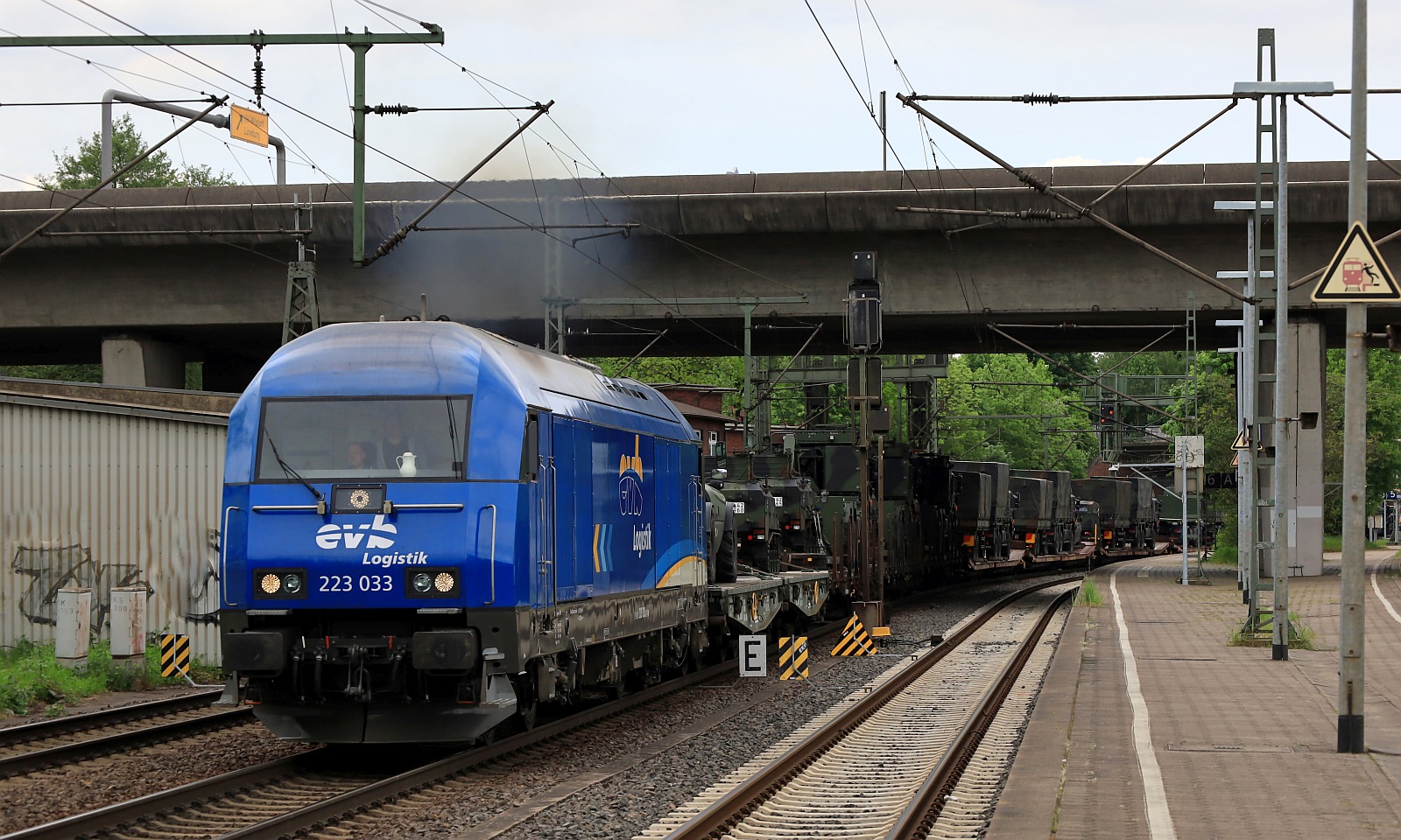 EVB 223 033-2 REV/OWS/02.06.23 mit kurzem Militärtransport unterwegs nach Maschen. HH-Harburg 04.05.2024