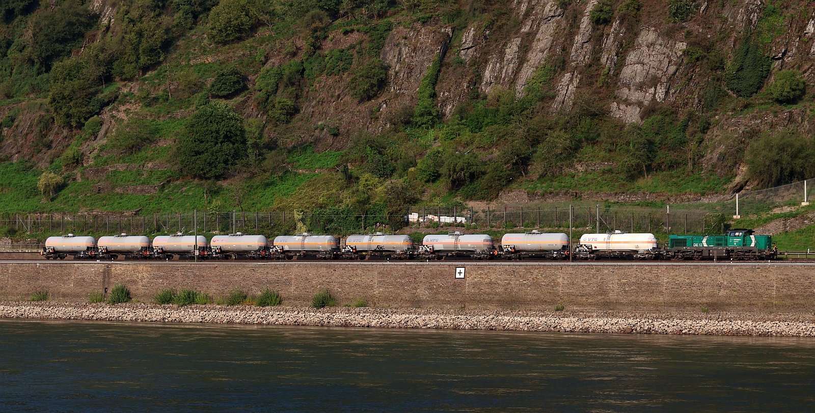 infraserv logistics 11 oder 4125 006-1 mit dem Mini-Kesselzug beladen mit A1 Flugzeugbenzin. Kaub 05.08.2024