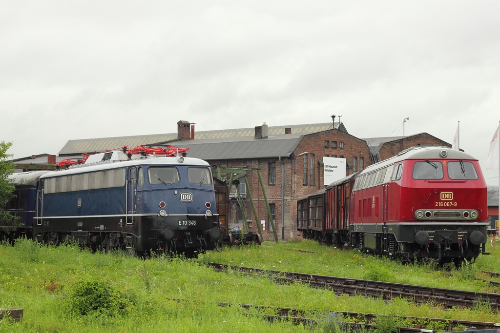 DB Museum E10 348 mit 216 067-9 abgestellt in Koblenz-Lützel am 13.7.2012