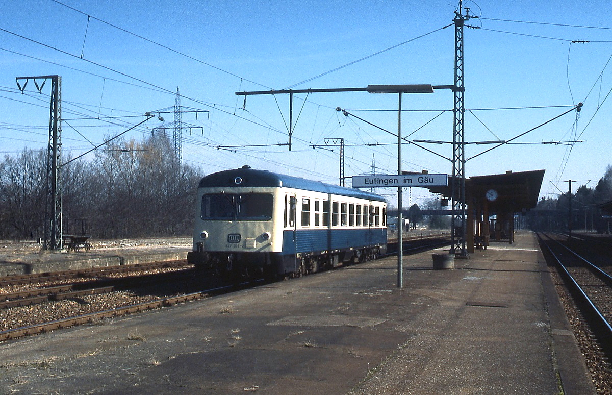 Im Februar 1988 verlässt 627 005-2 den Bahnhof Eutingen im Gäu in Richtung Hochdorf