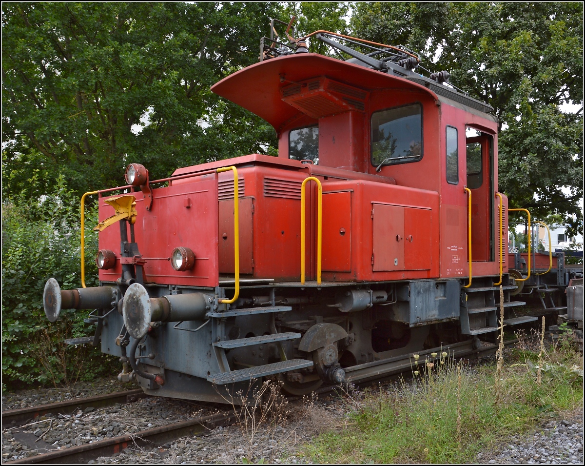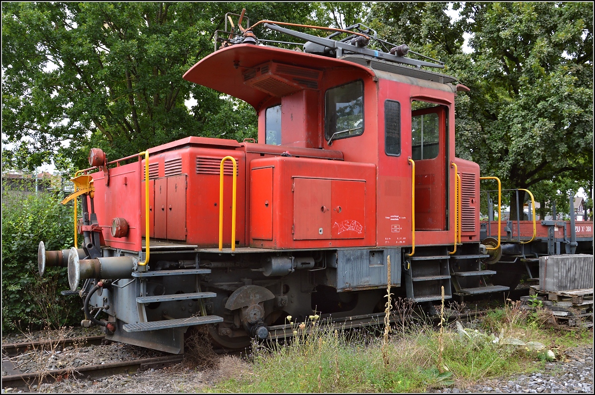 Tem II 295 wartet auf ihre Aufarbeitung. Das Antriebskonzept ist trotz Baujahr 1966 recht modern, denn dieser elektrische Rangiertraktor ist mit einem zusätzlichen Diesel für Fahrten auf Anschlussgleisen ausgestattet. Mit der Ee 923 oder der BR 187 wird das Prinzip wieder aufgegriffen. August 2014.