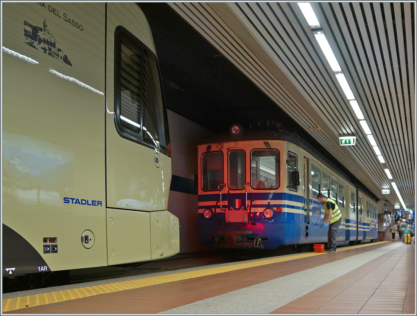 Der neue FART ABe 8/16 (UIC 90 85 1105-8) wartet im unterirdischen SSIF Valle Vigezzo Bahnhof als PE 72 47 auf die Abfahrt nach Locarno.