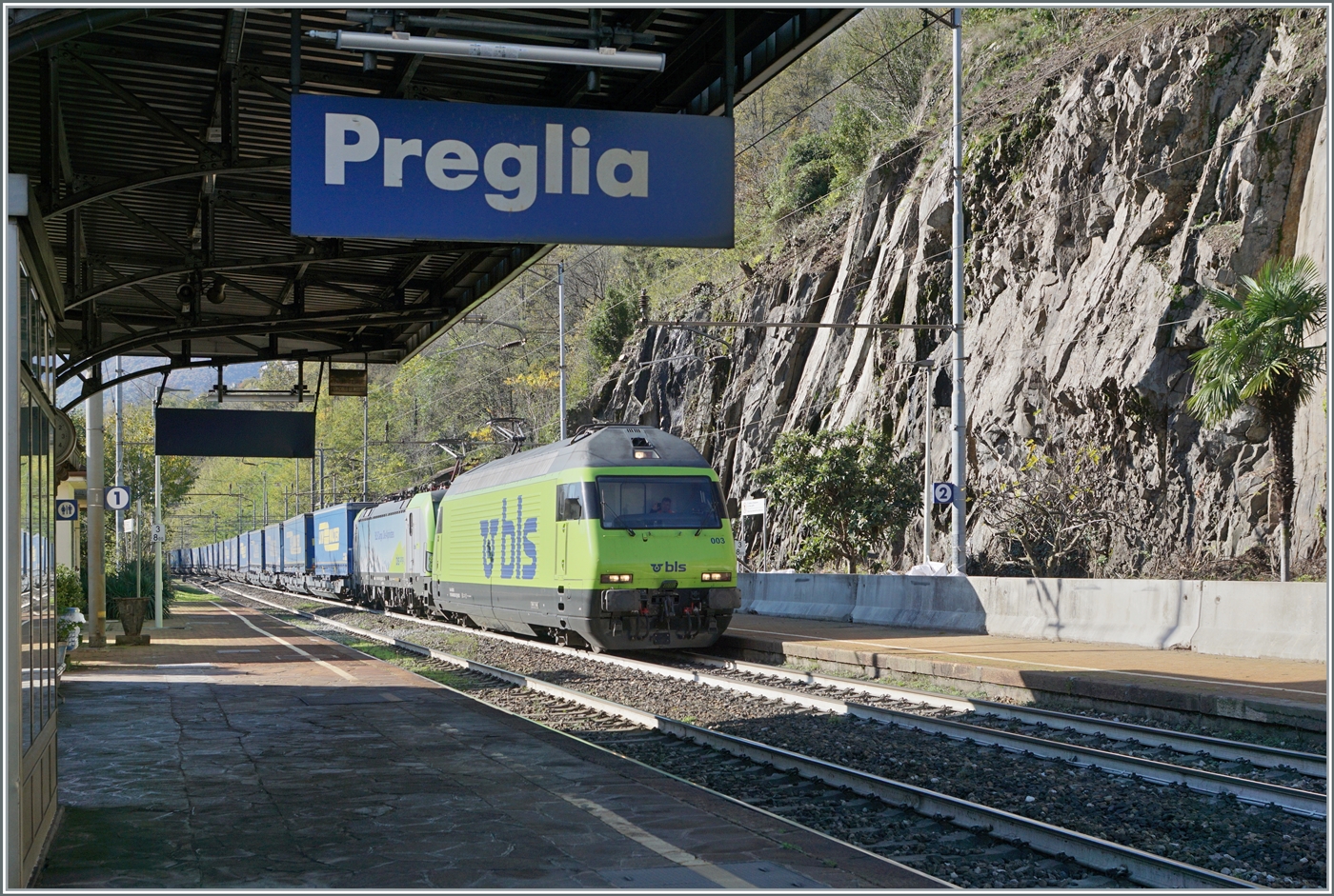 Die Re 4/4 11150 mit einem kurzen Güterzug kurz vor Preglia.