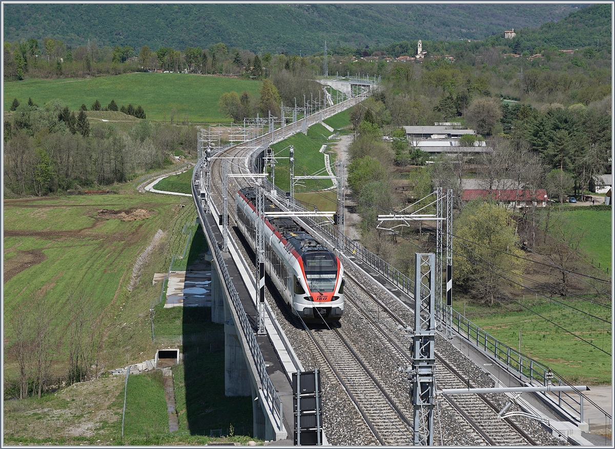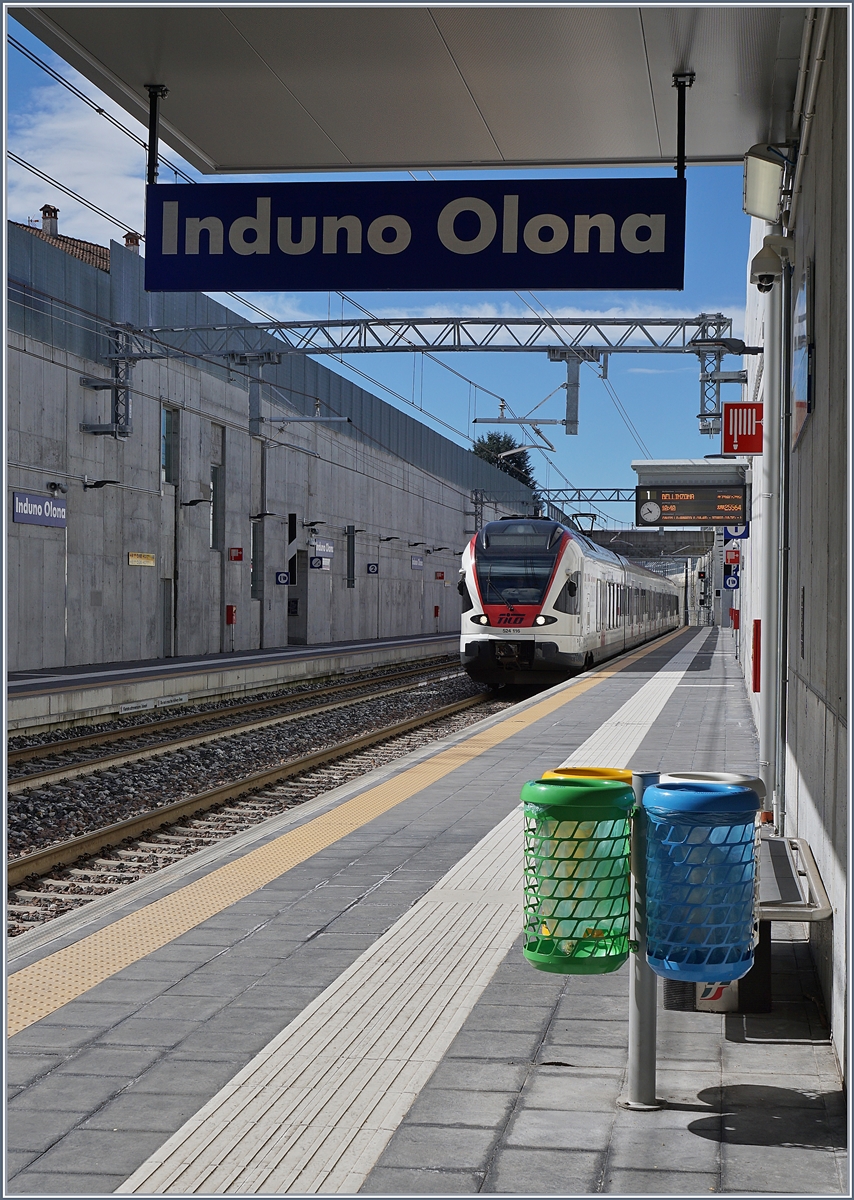Der Trenord RABe 524 203 als S 40 nach Como S.G. beim Halt in Cantello Gaggiolo und dies, wie ein Blick auf die Uhr und Anzeigetafel zeigt, "pünktlich wie die Eisenbahn".
