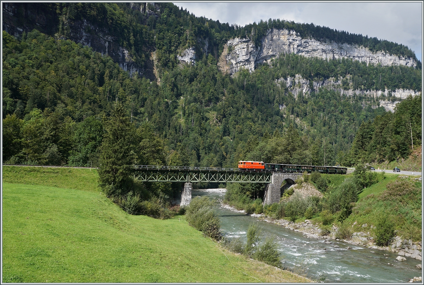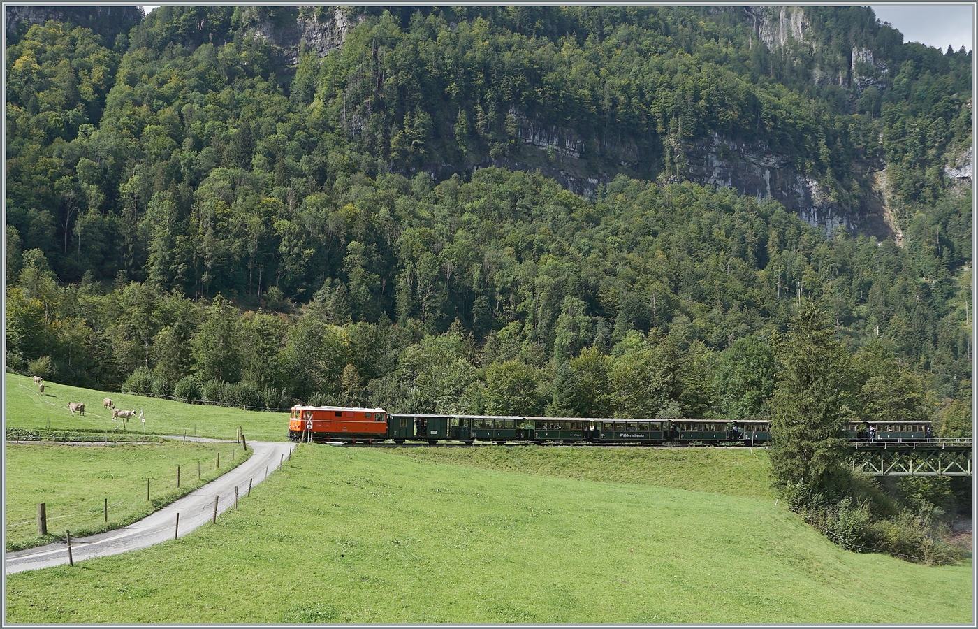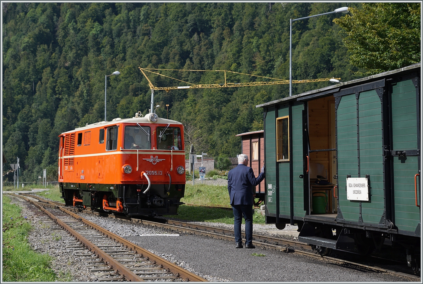 Die schöne (ex) ÖBB 2095.13 ist mit ihrem Vormittagszug von Bezau nach der Fahrt über die Bregenzer Ach schon fast am Ziel in Schwarzenberg angekommen.