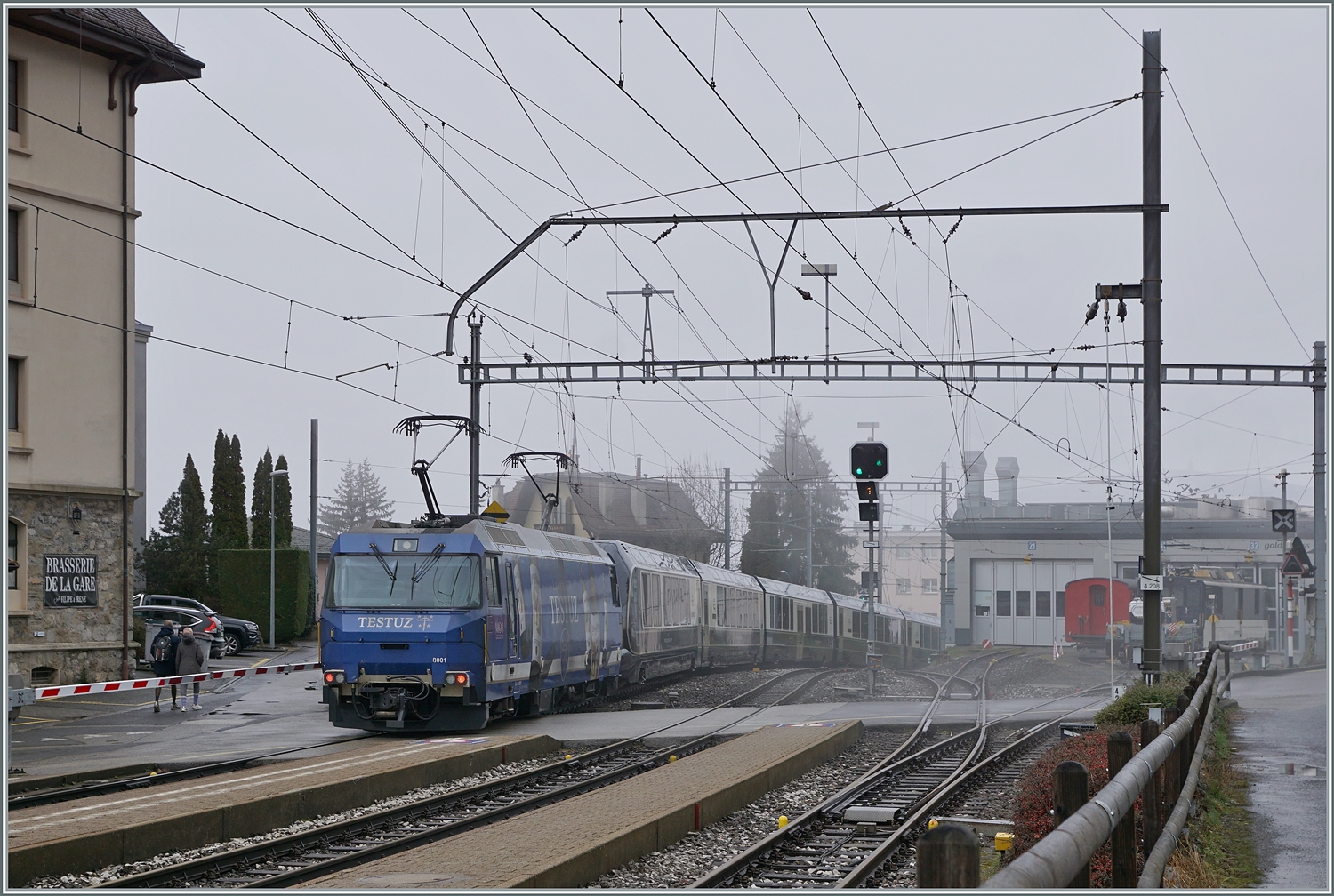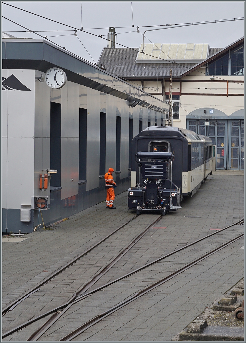 Die MOB Ge 4/4 8002 wartet mit dem GoldenPass Express GPX in Montreux auf die Abfahrt.