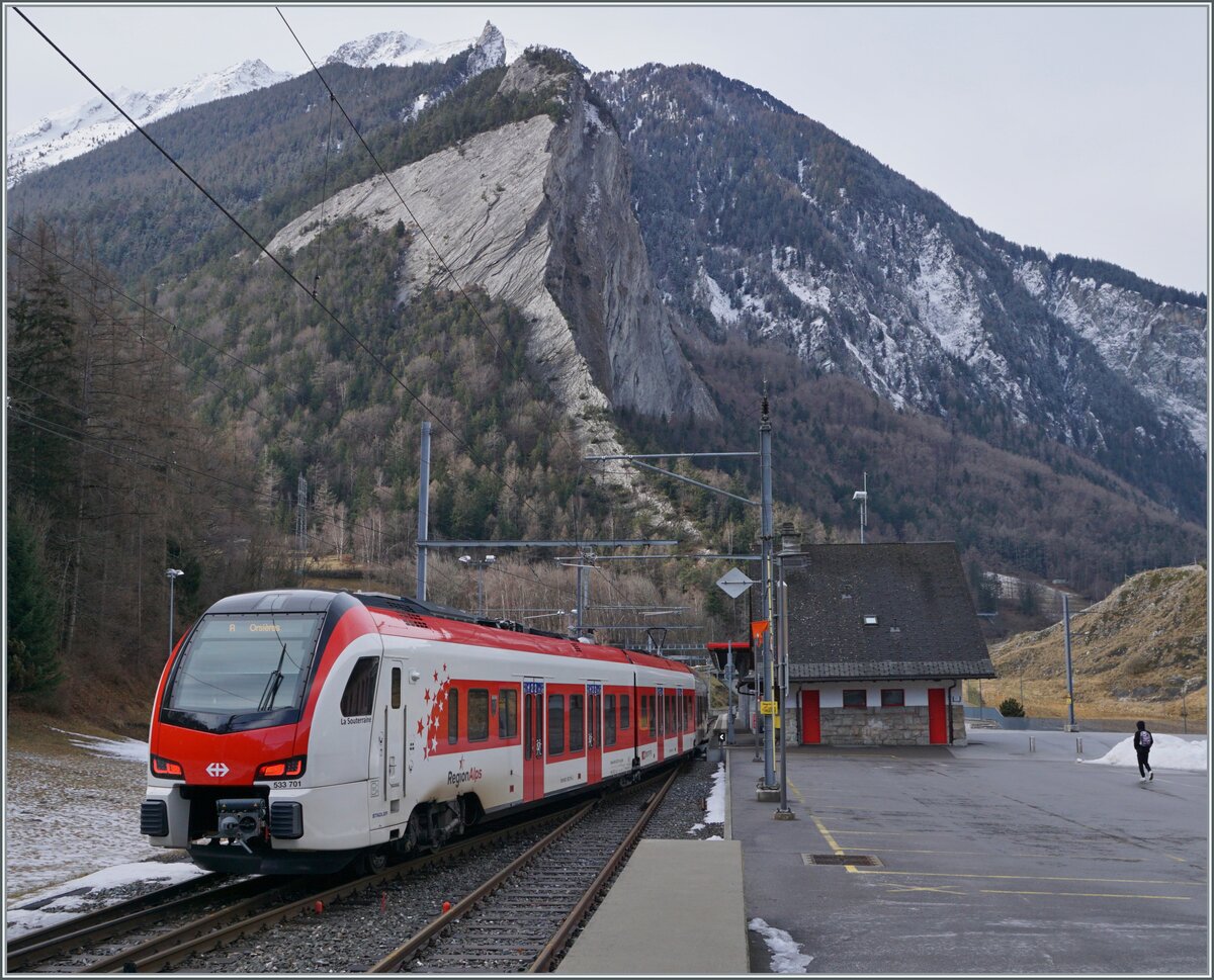 Von Le Châble kommend fsind die beiden TRM Region Alpes RABe 525 "NINA" an ihrem Ziel in Martngy angekommen.