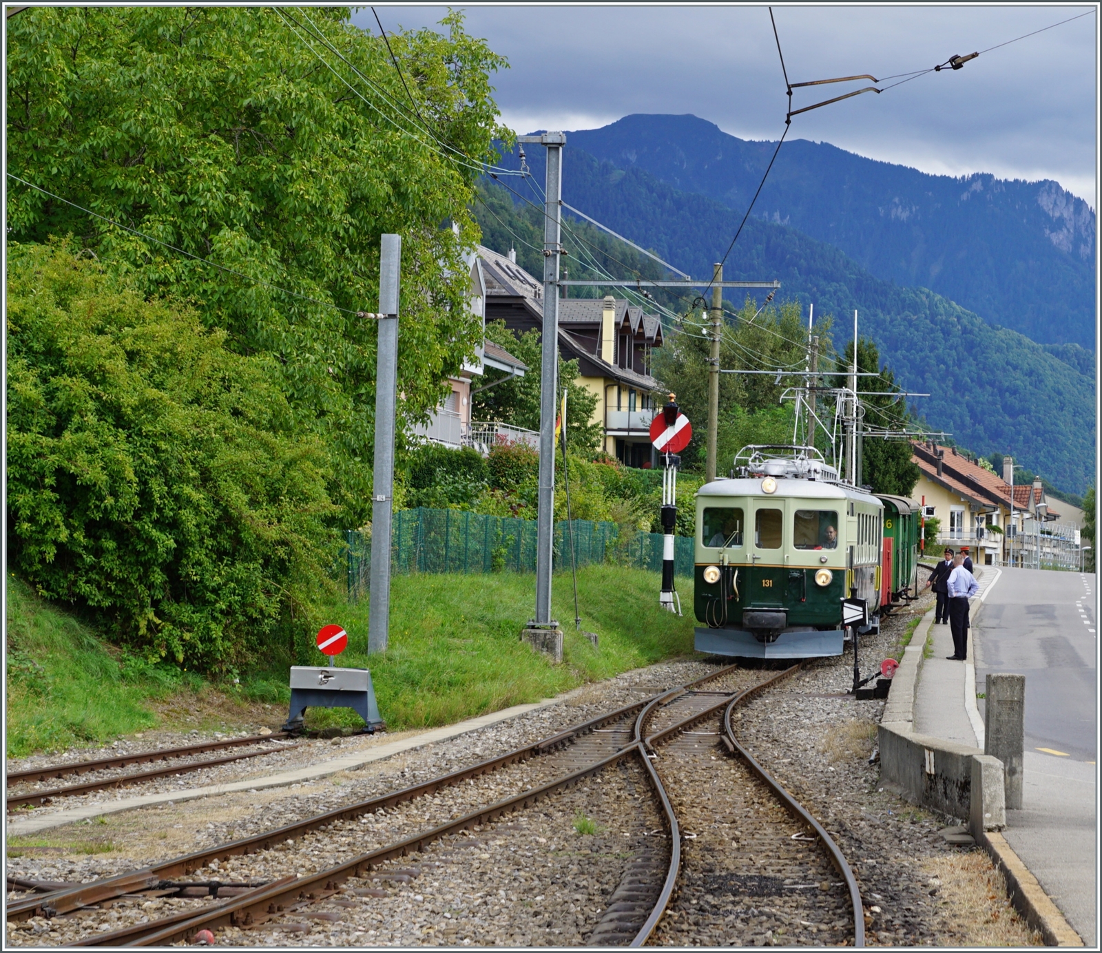 Das Bild zeigt beide Triebwagen beim gemeinsamen Manöver in Blonay.