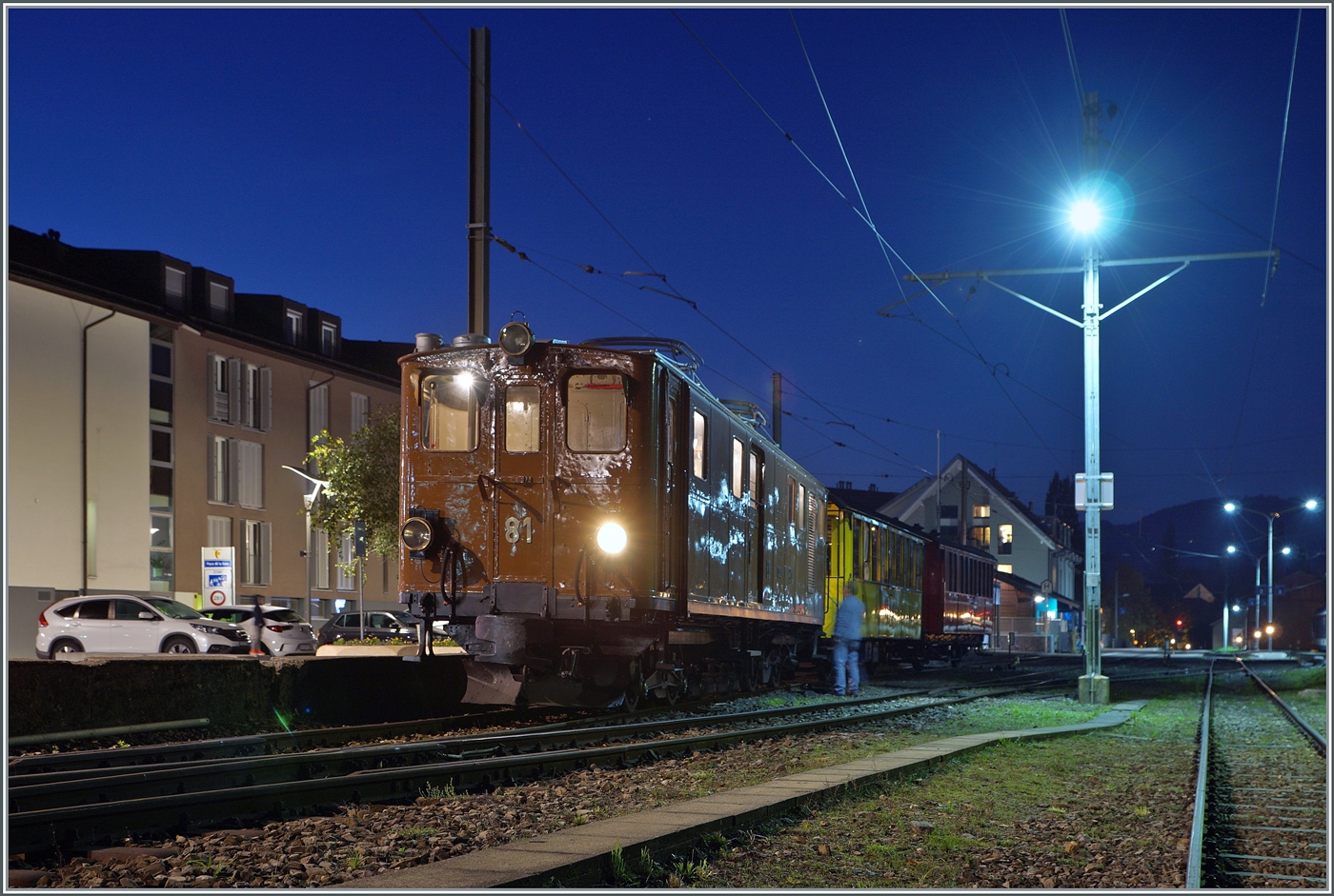 La DER de la Saison / Das Saison Ende der Blonay Chamby Bahn 2024 - Seit einigen Jahren zeigt die Blonay Chamby Bahn zum Saison Ende mit einem verdichteten Fahrplan noch einmal ihrer herrlichen Fahrzeuge im Einsatz. Zum Abschluss des Tages gab es für meinen Geschmack den Höhepunkt der Saisonabschlussfeier: Die RhB Ge 4/4 N° 81; die herrliche Lok rangiert in Blonay, um dann den 17:10 Zug in Richtung Chaulin zu führen.