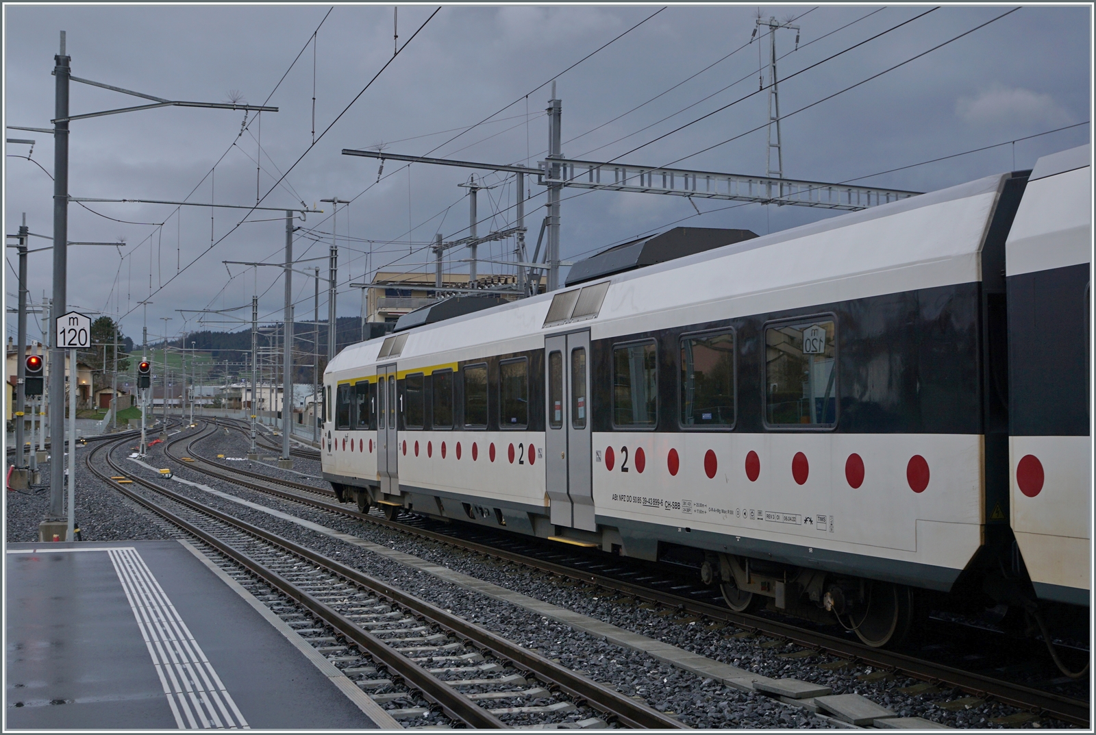 Bei einen interessanten Wetter wartet der von der SBB an die TPF ausgeliehene RBDe 560 Domino auf die Weiterfahrt nach Broc-Village.