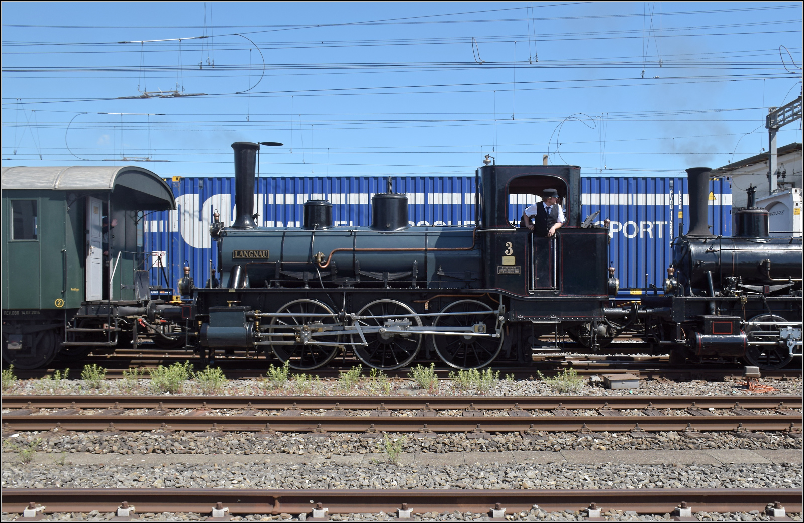 E 3/3 853 der Jura-Simplon und Ed 3/3 3 'Langnau' der Emmentalbahn rangieren im Bahnhof Burgdorf den Sonderzug in die Abstellgruppe. Mai 2025.