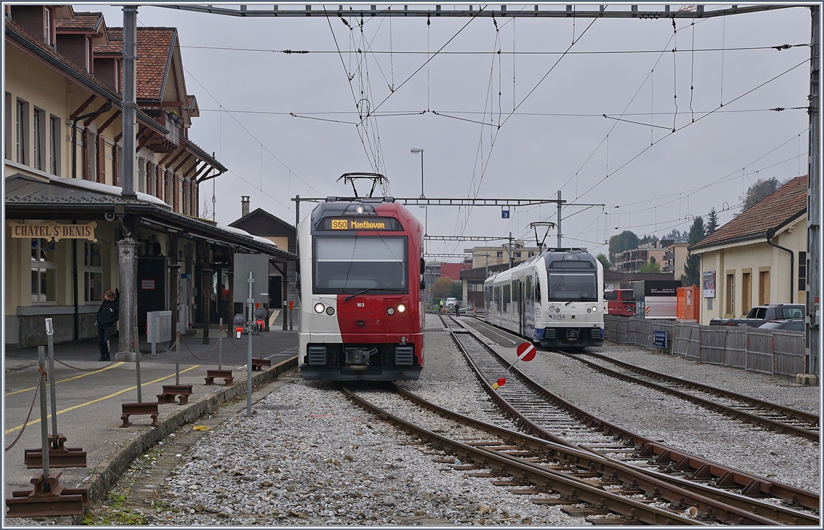 Ein TPF SURF ABe 2/4 - B - Be 2/4 wartet in Châtel St Denis auf die Abfahrt nach Montbovon. Im Hintergrund wartet ein weiterer Ein TPF SURF ABe 2/4 - B - Be 2/4 aus seinen Einsatz. Die Tage des Bahnhofs sind gezählt der "neue" bereits im Bau.