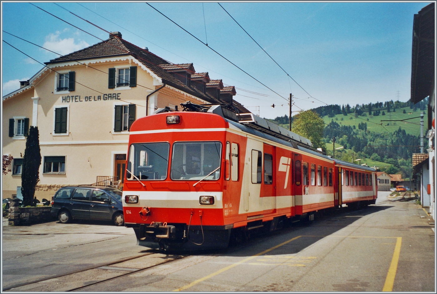 Ziemlich eng ging es auf dem Bahnhofsvorplatz in Glovelier zu: Im Sommer 1997 steht ein CJ-Zug nach La-Chaux-de Fonds, am Zugschluss BDe 4/4 I 603, zwischen dem Hotel de la Gare und dem Bahnhofsgebäude
