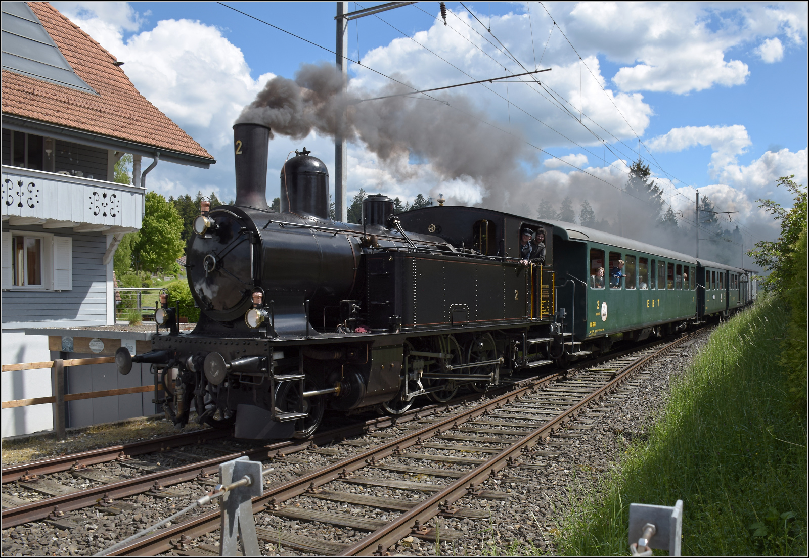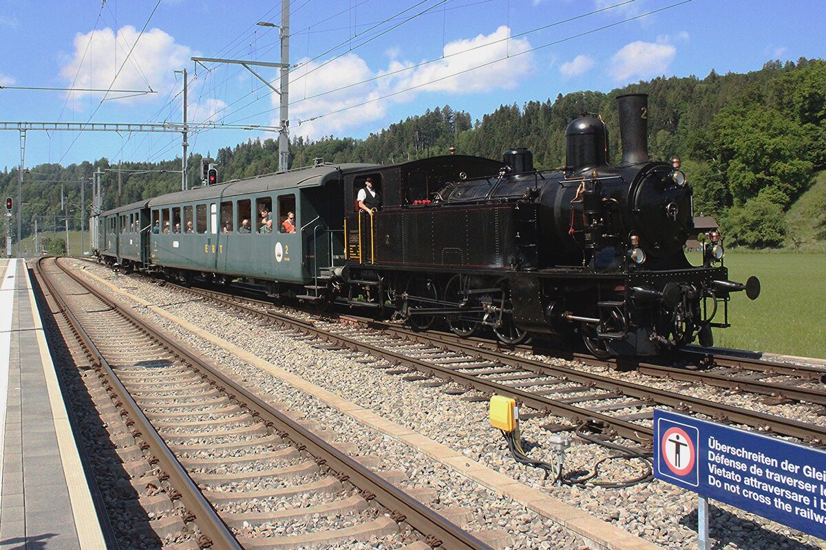 EBT-2 zieht ein Dampfzug durch Grieswald am 18 Mai 2025 während das Spektakel  150 Jahre Emmentalbahn  und wird vom offenbarer Weg fotografiert.