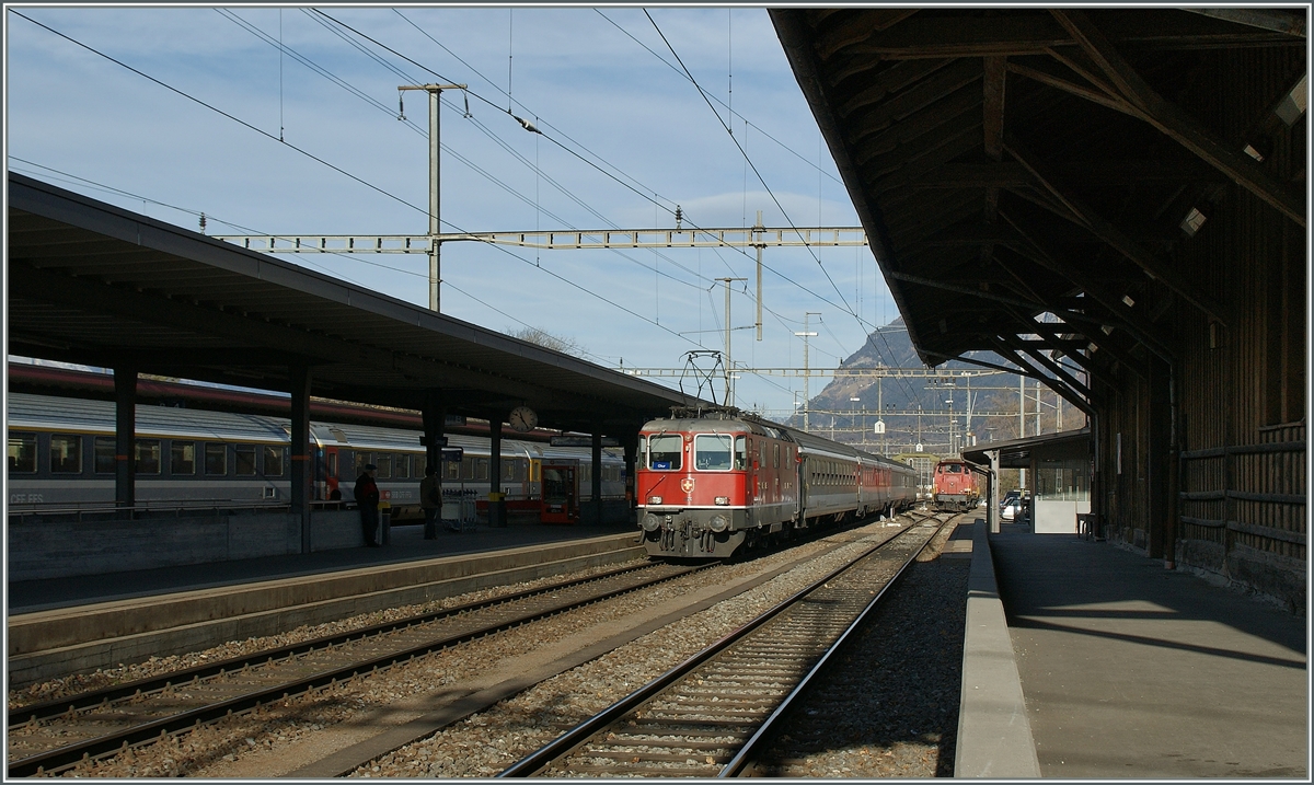 Re 4/4III 11366 und eine unbekannt gebliebene Re 420 rangiern in Landquart. November 2015.