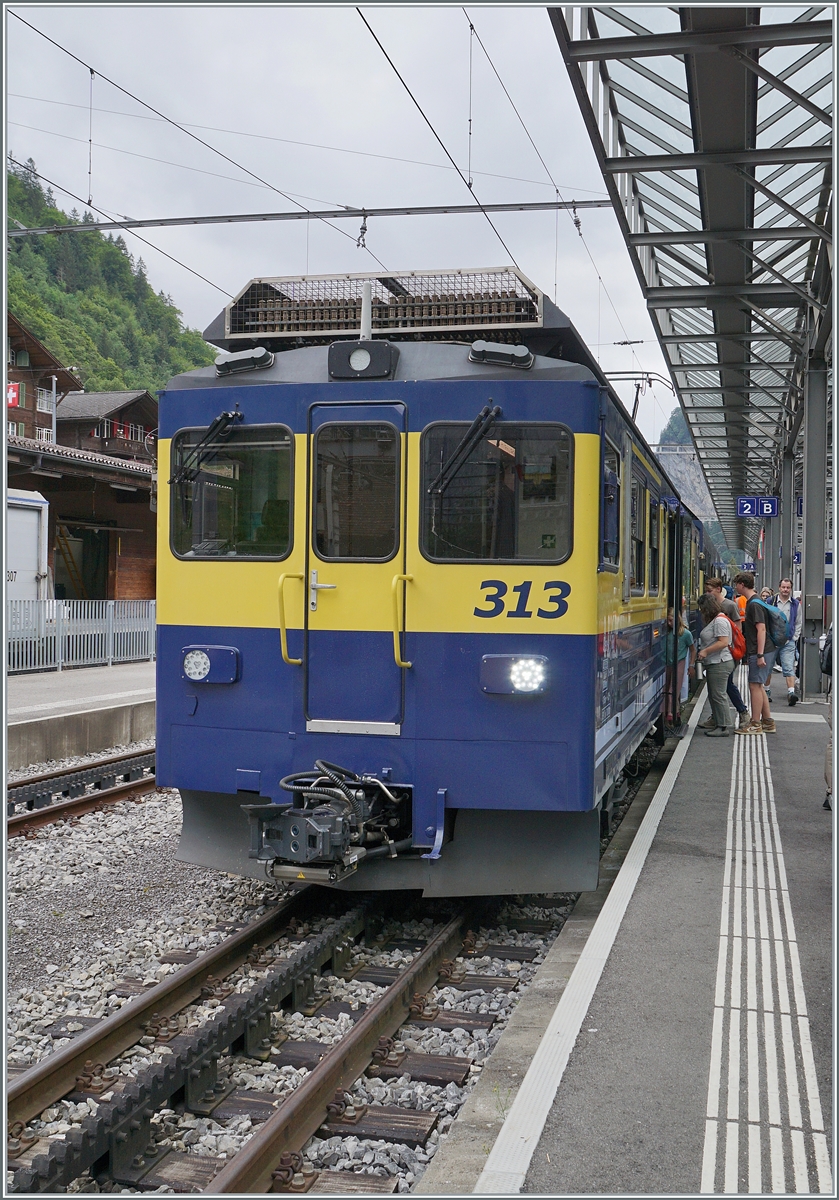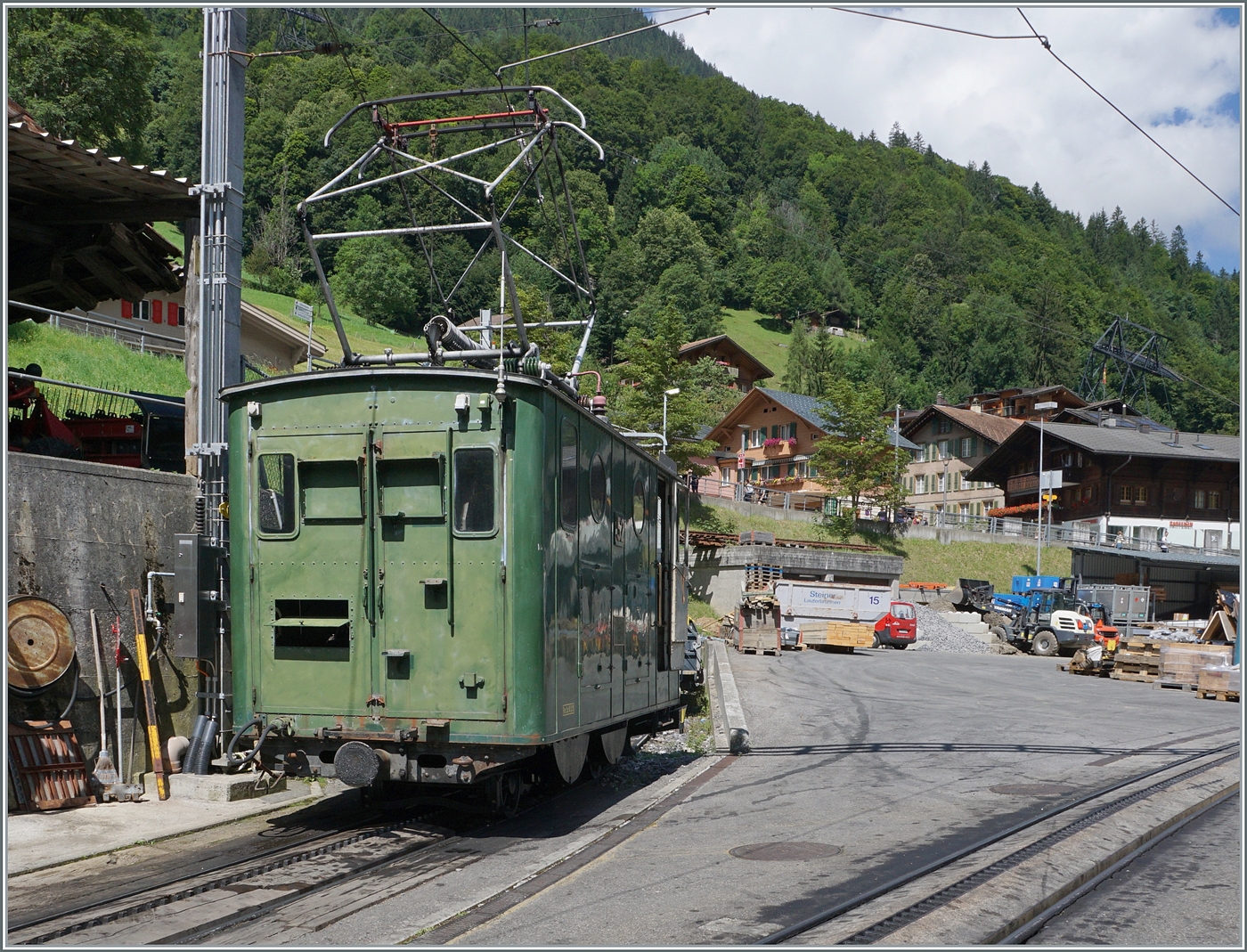 Der WAB BDhe 4/4 115 ist mit seinem Uaikt 821 in Lauterbrunnen angekommen und der Gütersteuerwagen wird sofort entladen.
