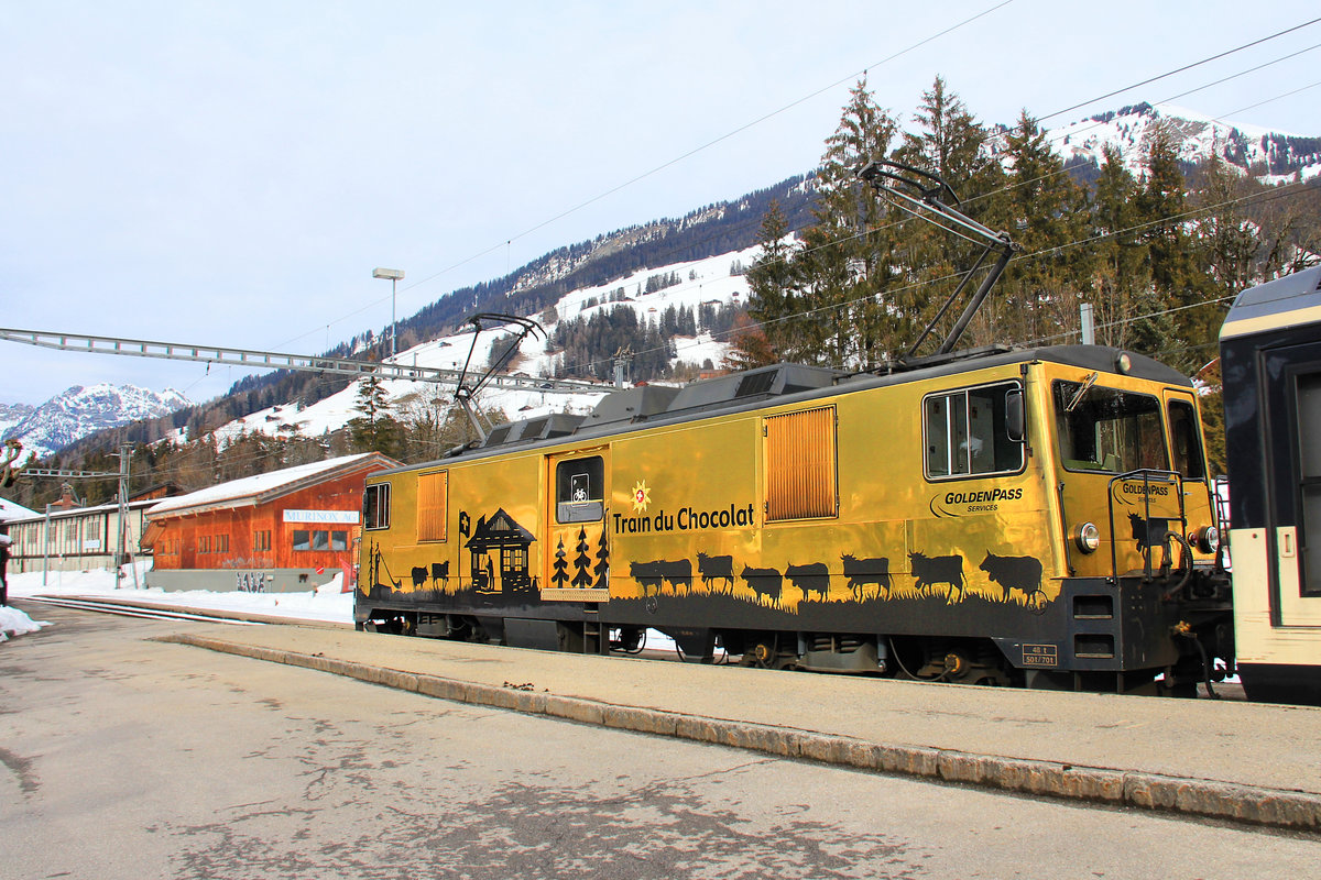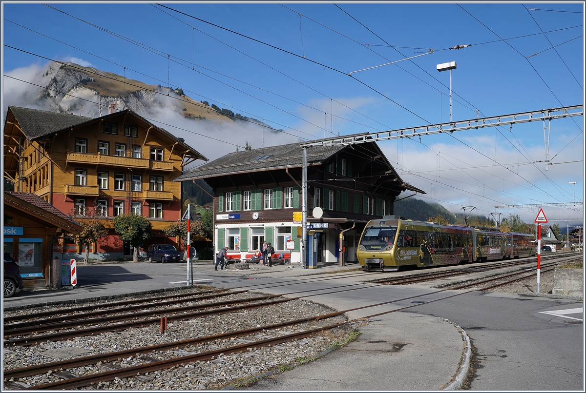 The MOB ABt 344 - Be 4/4 5004 - Bt 244 (-> "Lenkerpendel") erreicht von Zweisimmen kommend sein Ziel Lenk im Simmental.