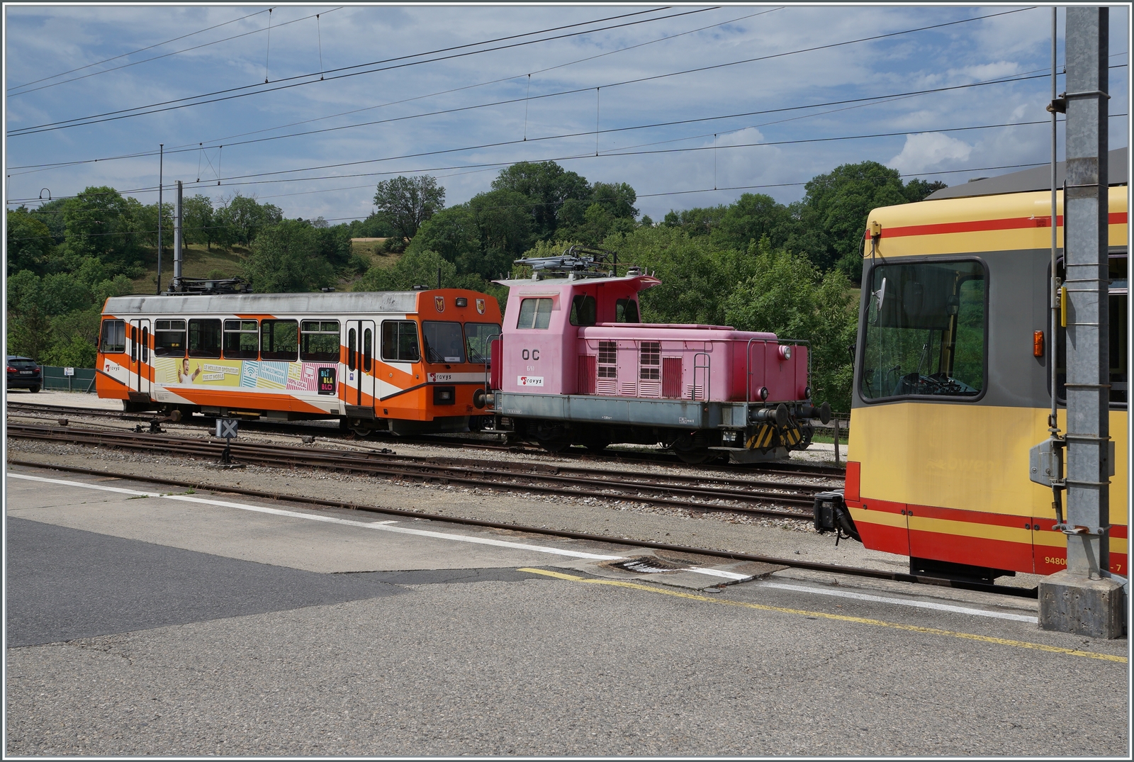 Die Strassenbahn "Be 4/8 003" alias 94 800 450 003-9 D-TVYS wartet in Orbe auf die nächste Ausfahrt nach Chavornay, um die Fahrgäste von den S-Bahnen dort abzuholen. Man beachte auch ein im Bild winziges Detail, das Läutewerk ist noch am Empfangsgebäude installiert. Dezember 2025.