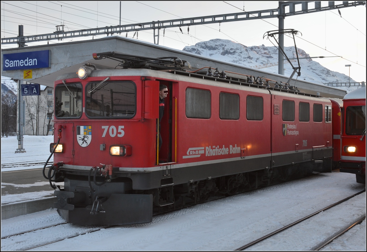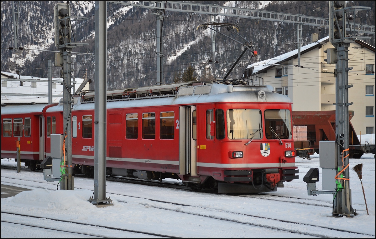 Be 4/4 514 der RhB steht als Regio nach Scuol-Tarasp in Samedan bereit. Januar 2020.