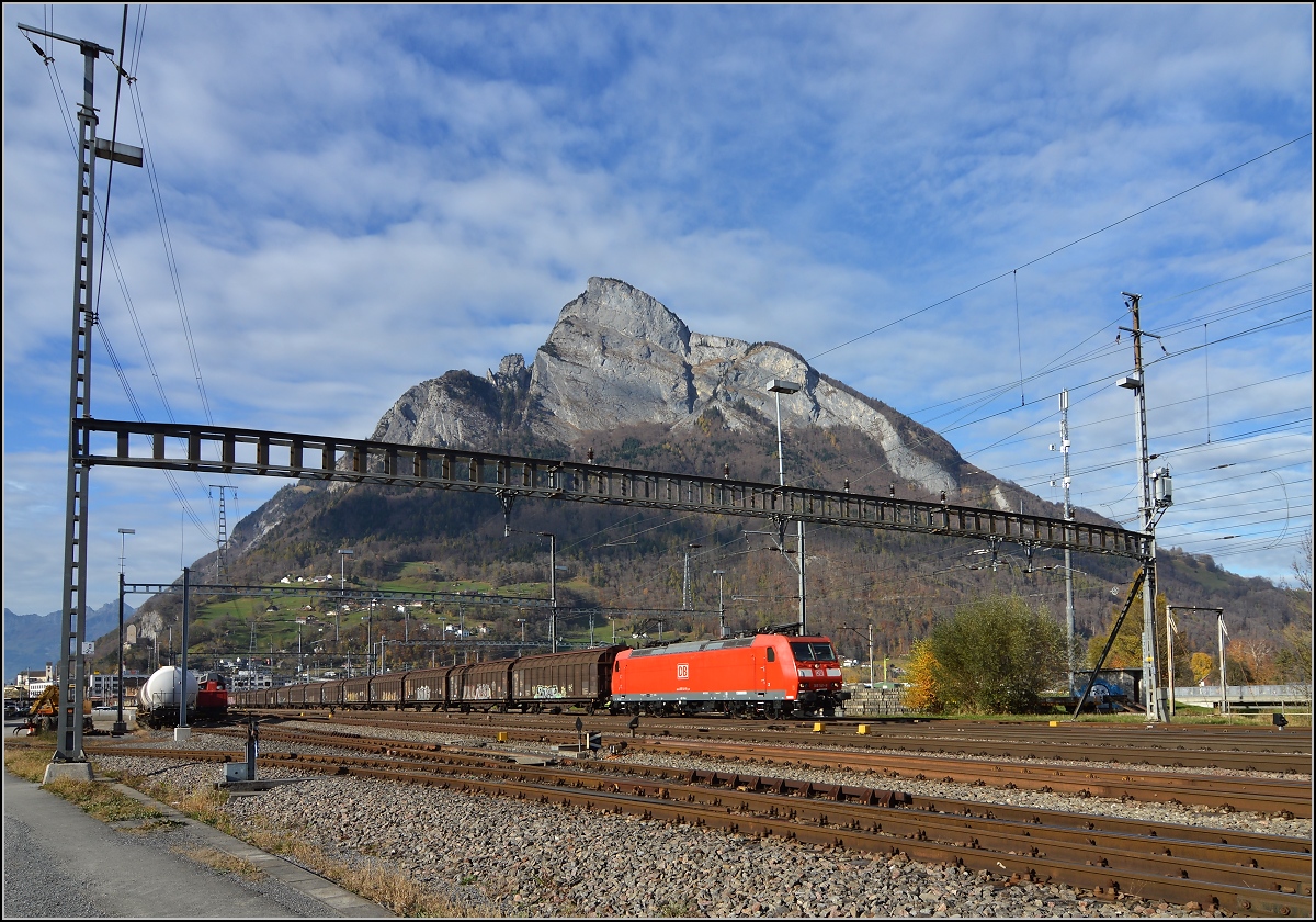 Wie ein Rugby-Tor umrahmt das riesige Joch des Oberleitungsmasten den Red-Bull-Zug und den Gonzen. Zugmaschine ist die 185 141-9. Sargans, November 2015.