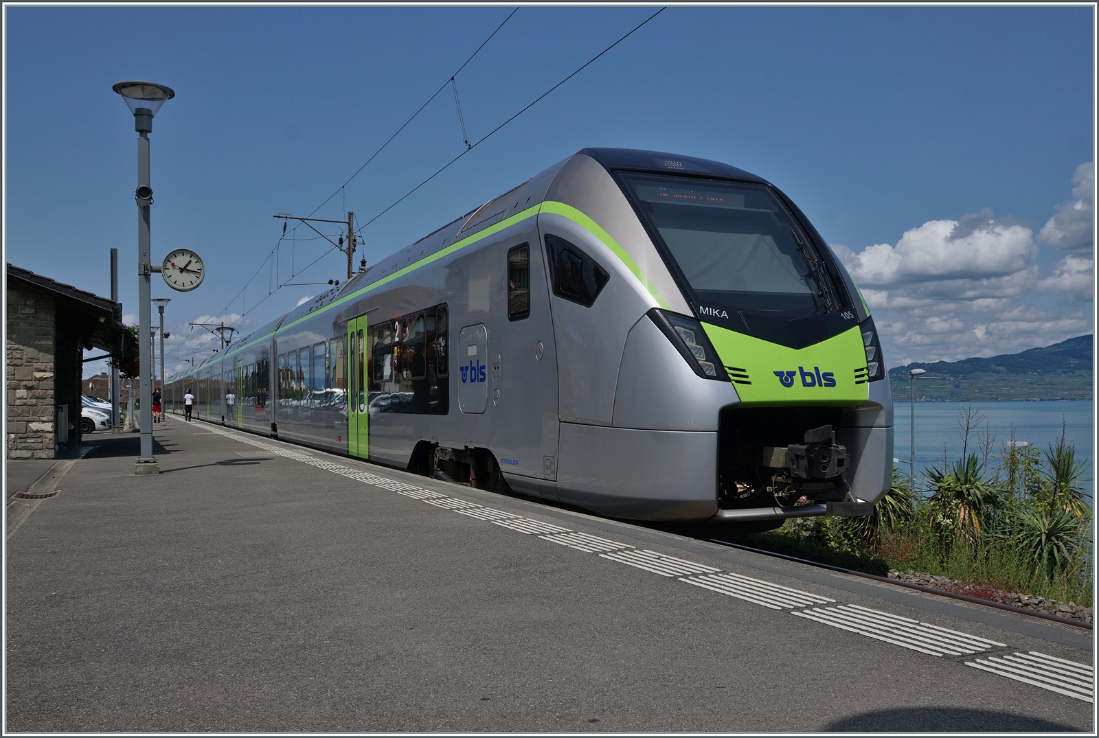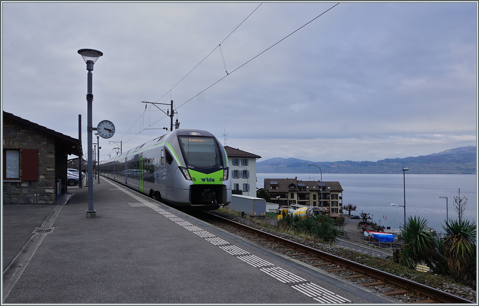 Ein Blick vom Schiff auf "Hafen" und "Bahnhof" von St-Gingolph. Da die Wendezeit der Züge in St-Gingolph gut 50 Minuten beträgt, ist fast zu jeder Zeit ein Zug im "Bahnhof" zu sehen. hier wartet ein Region Alpes RBDe 560 Domino als R91 auf die Rückfahrt nach Brig.