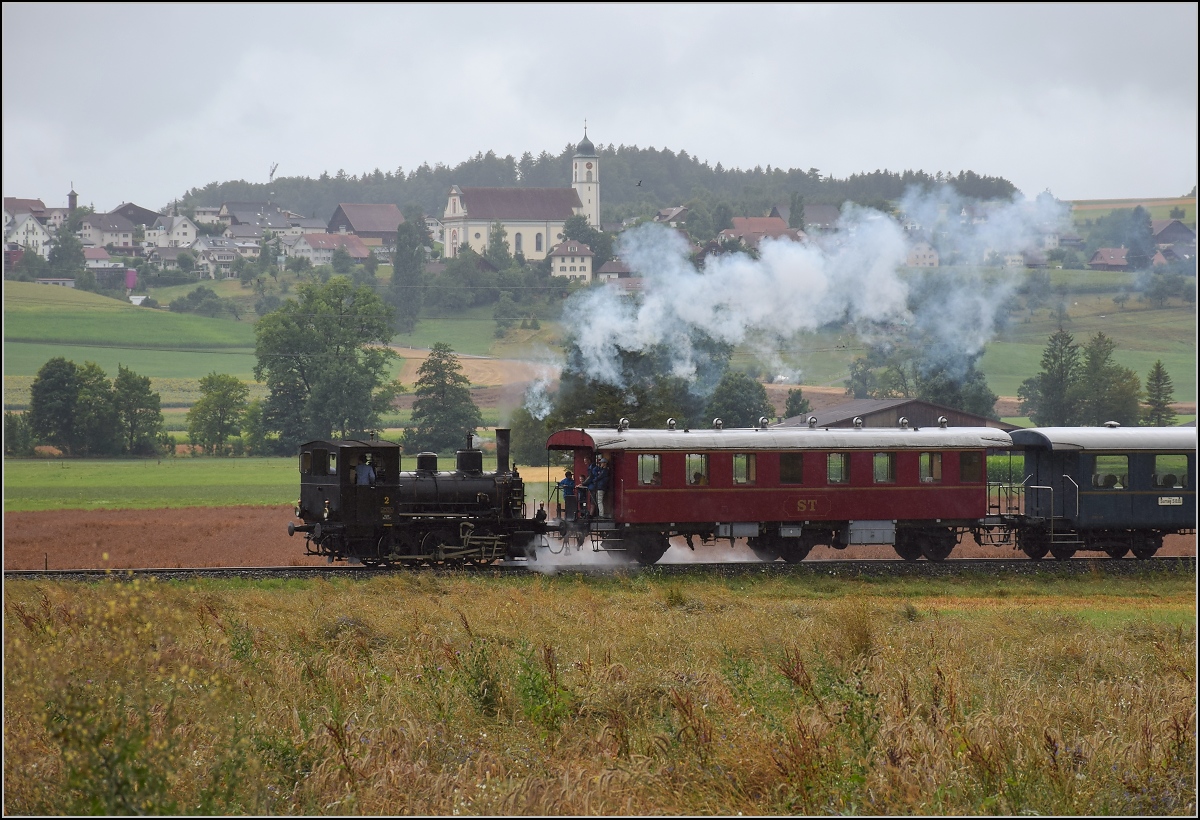Die ST E 3/3 5 ist mit ihrem Zug in Sursee angekommen. Auch hier ist der Gepäckwagen miten im Zug eingereiht.