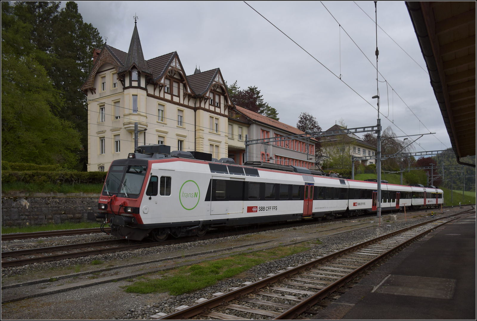 Ankunft von E 3/3 8511 mit ihrem Zug in Travers. Mai 2023.