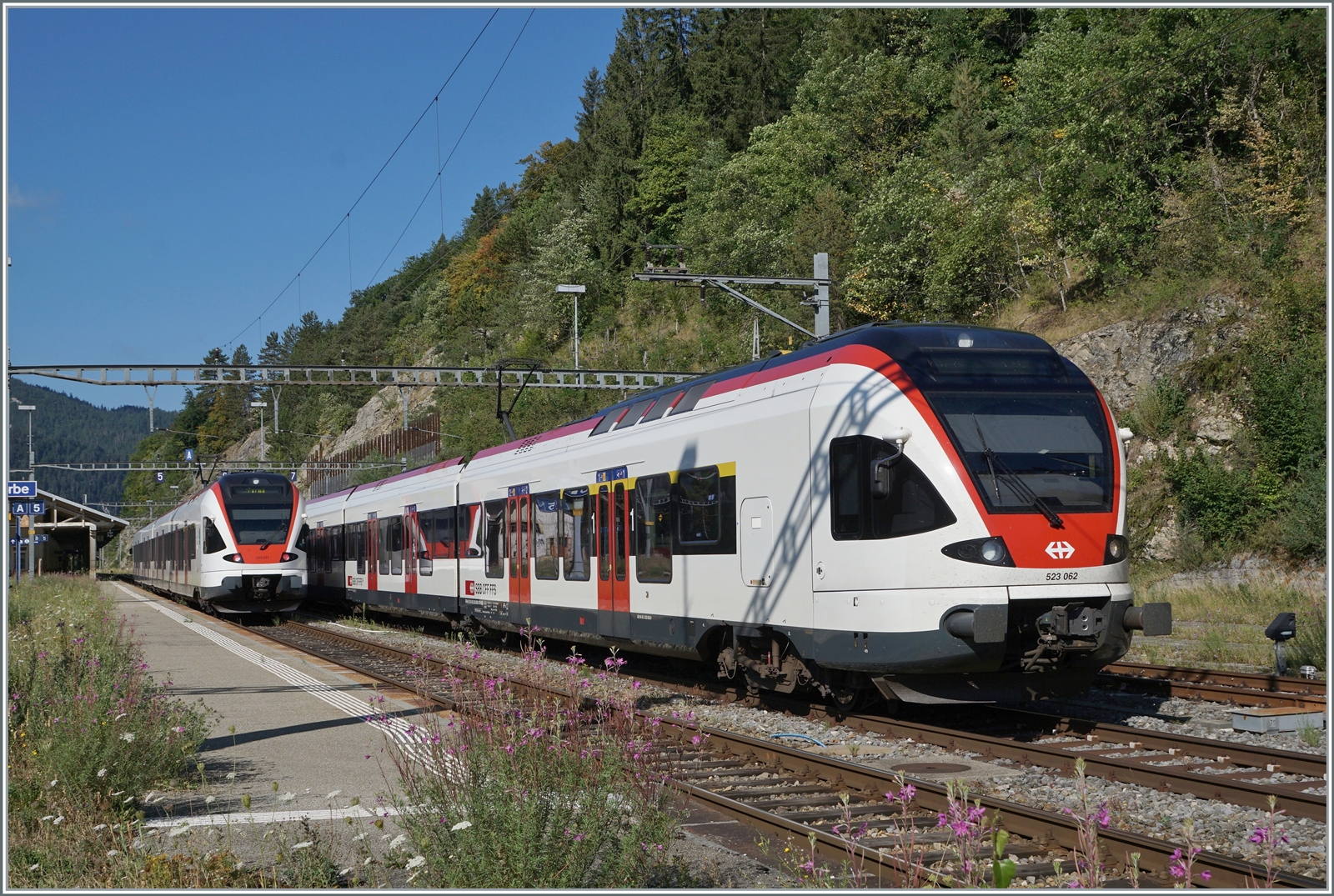 Mit dem ABt an der Spitze verlässt ein TRAVYS Domino den Bahnhof von Vallorbe in Richtung Le Brassus.