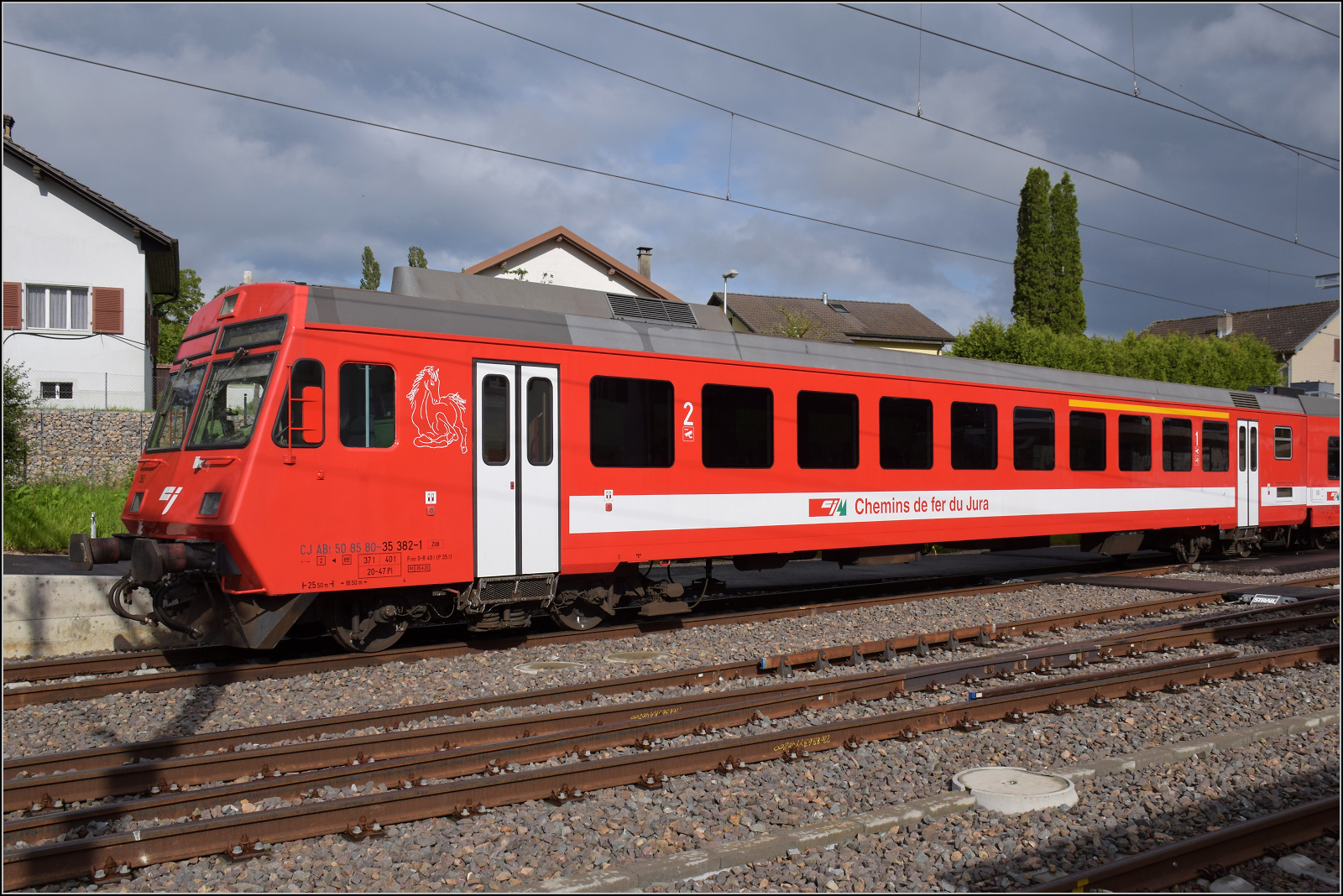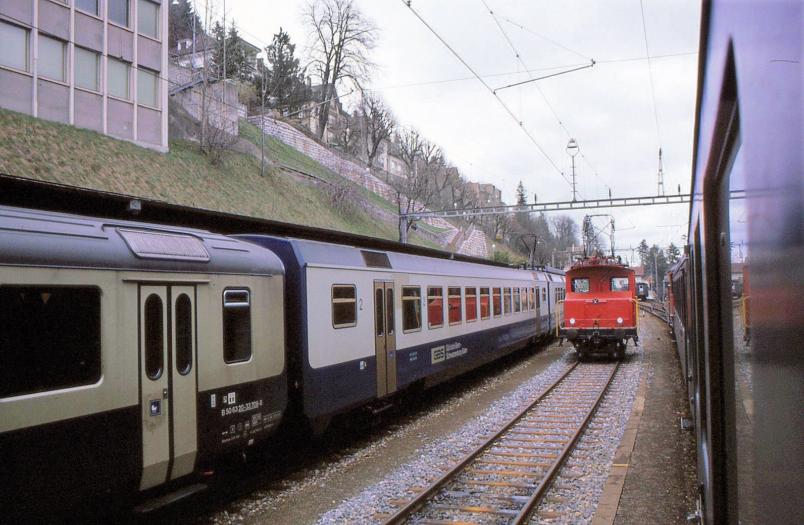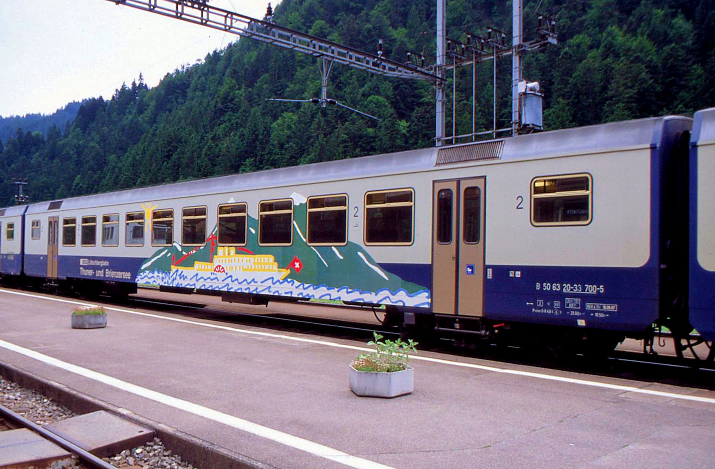 Der aus Spiez in Zweisimmen eingetroffene RE zeigt sich noch mit zwei blauen BLS Wagen.