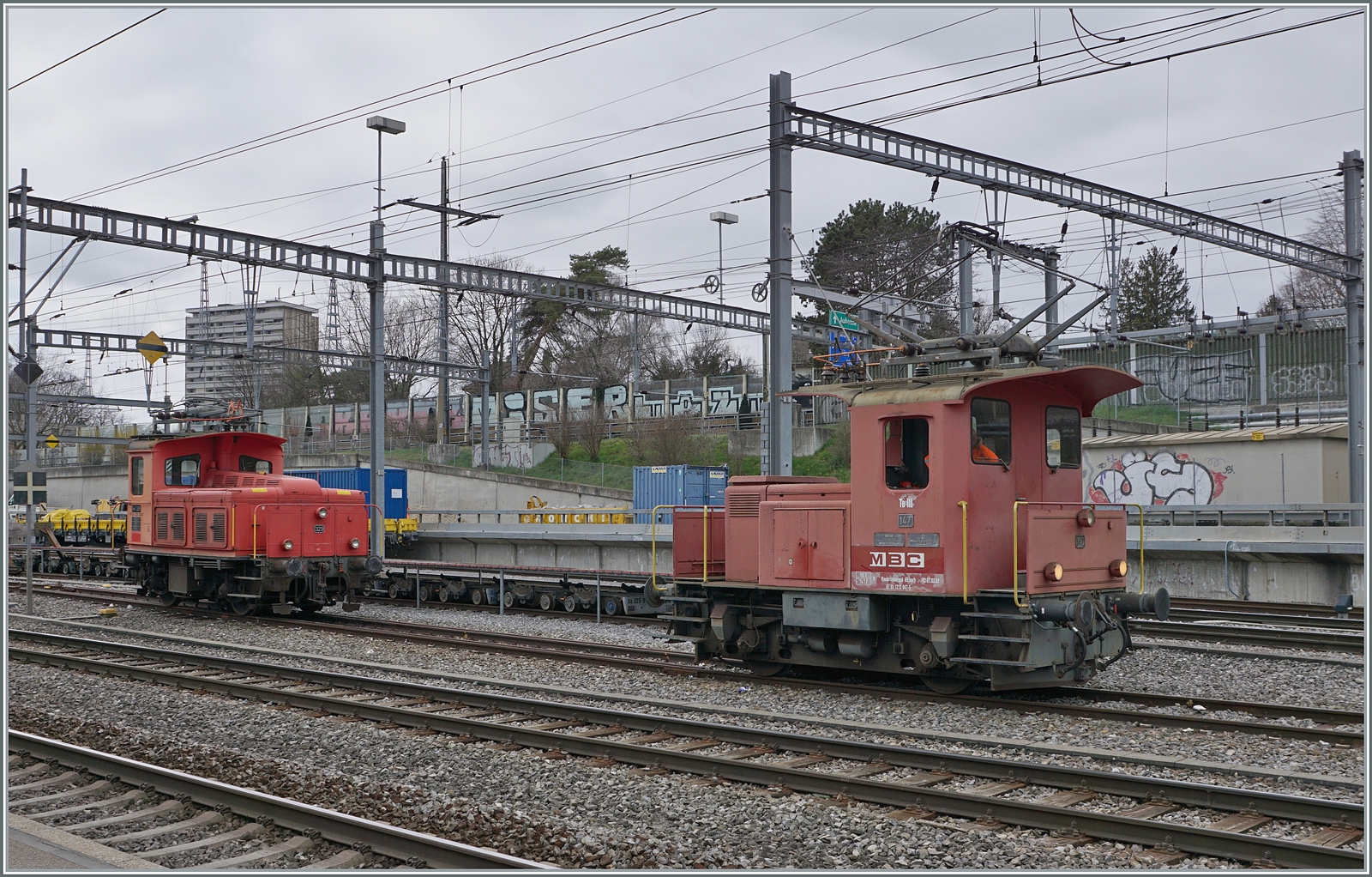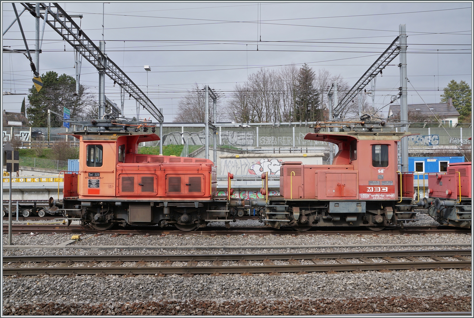 Ein Blick in den Bahnhof von Le Sentier Orient zeigt den Steuerwagen ABt 5 85 80 33 3758-7 des ausnahmsweise hier abgestellten Schülerzuges und den Tem III 329 (97 85 1220 329-7).