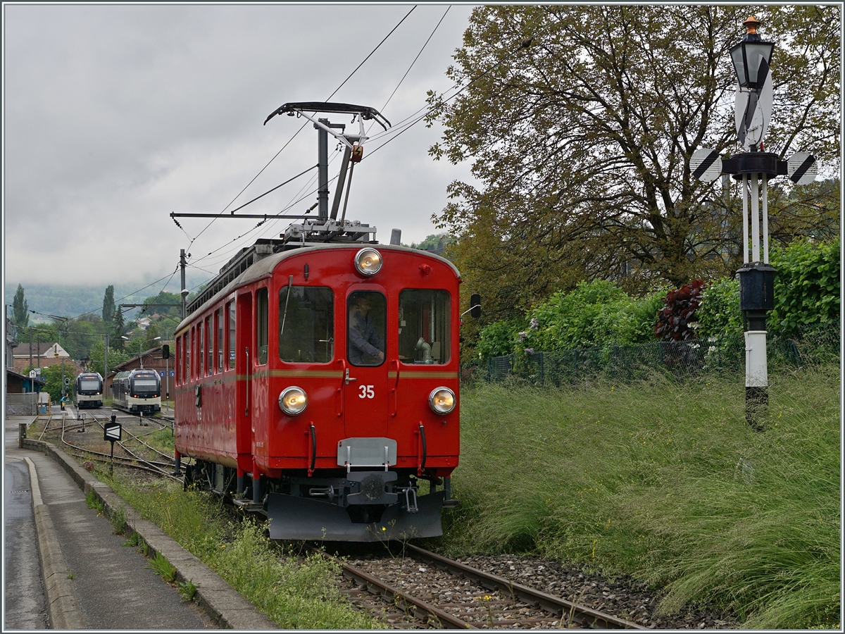 Eine ziemlich eigenwillige Komposition gab es am Morgen des 23. Aug. 2019 in Blonay zu sehen: die MOB GDe 4/4 6001 zieht den ABt 344 und einen dazugehörenden Bt von Chamby kommend Richtung Vevey.