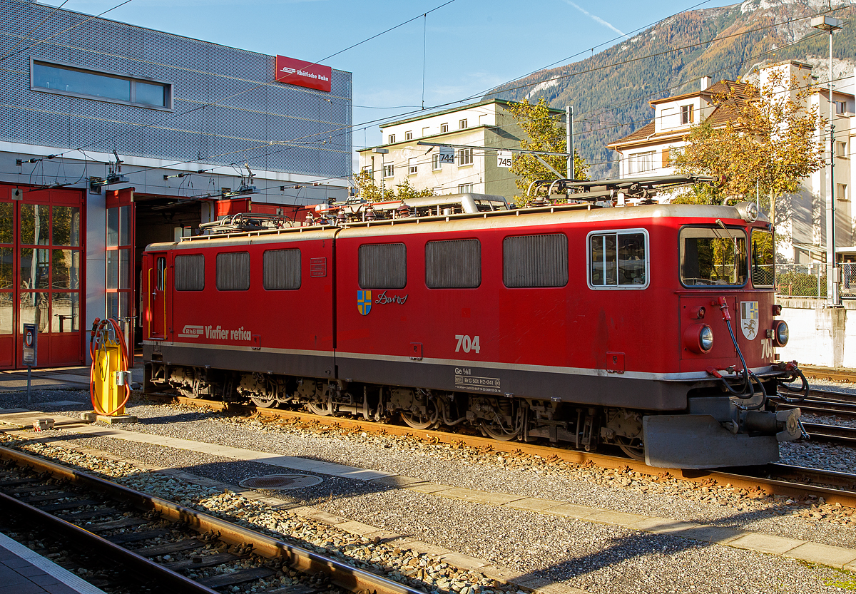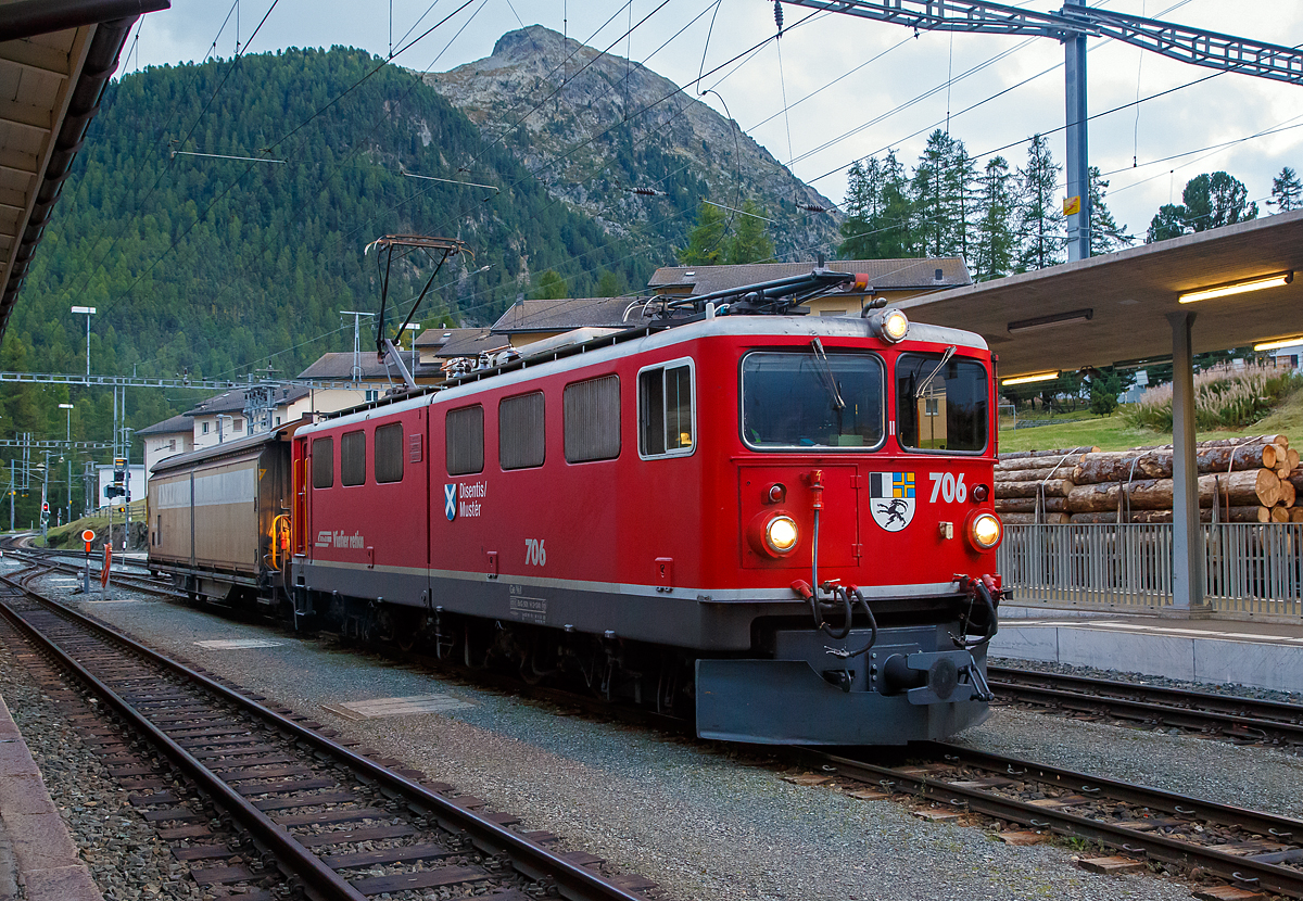 Die RhB Ge 6/6 704 mit einem Nordwärts fahrenden Gèterzug auf em Albula-Viadukt III zwischen Preda und Muot.