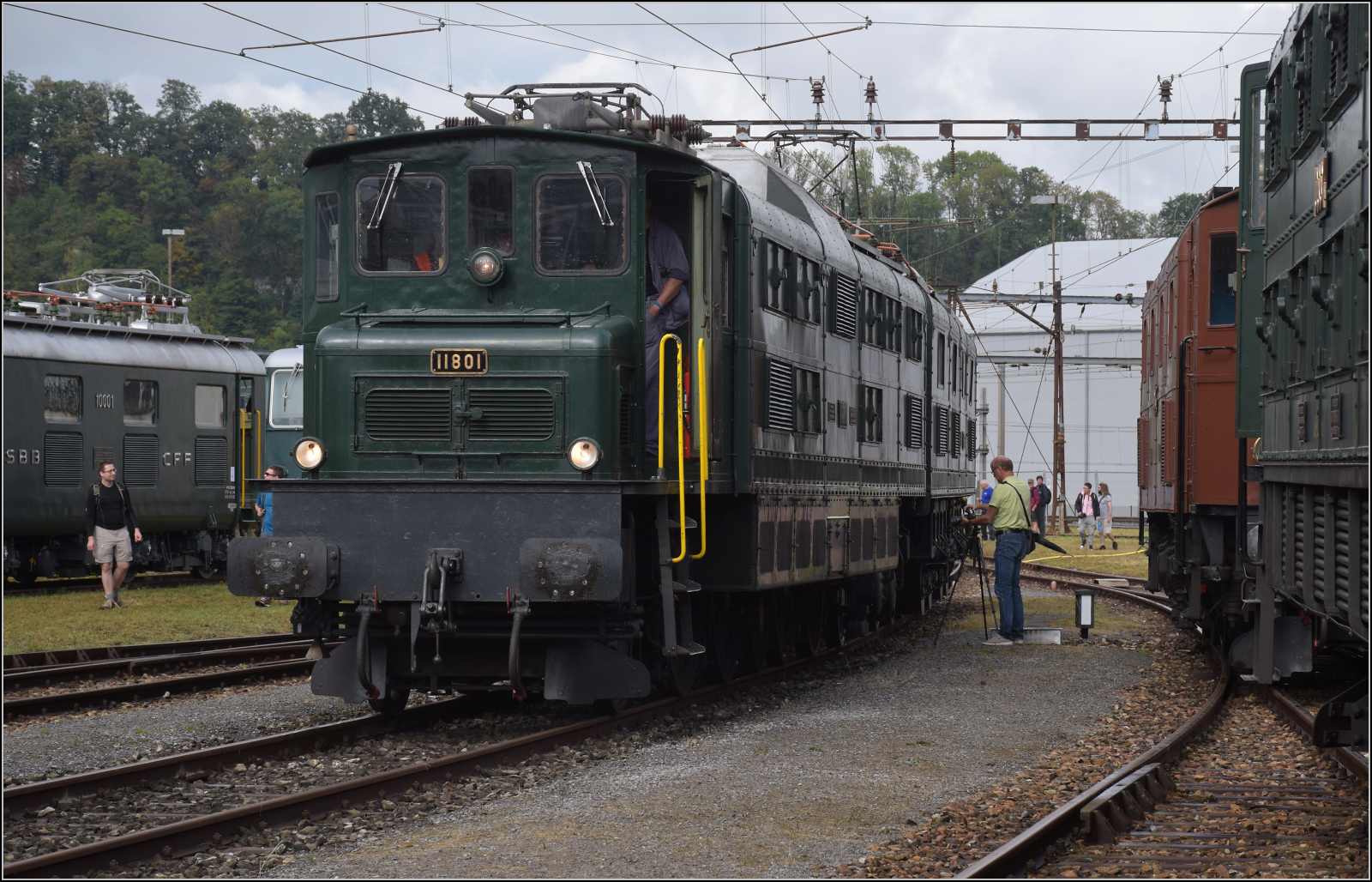 Kaum waren alle Gäste da, ging der Regen los. Gemeint sind auch die auf der Schiene angereisten Gäste mit den vielen Stahlrädern. Der Stimmung tat es keinen Abbruch. Wer sich in den Regen gewagt hatte, wurde mit ungestörtem Blick auf die Exponate belohnt. Im Bild sind vereint von links: Ae 8/14 mit der Schnauze, Ae 3/6 I 10664, Ae 6/6 11415 'Aargau', Ae 3/6 II 10469, Ae 3/5 10217,  Ae 4/7 11026 und Ae 3/6 III 10264. August 2023.