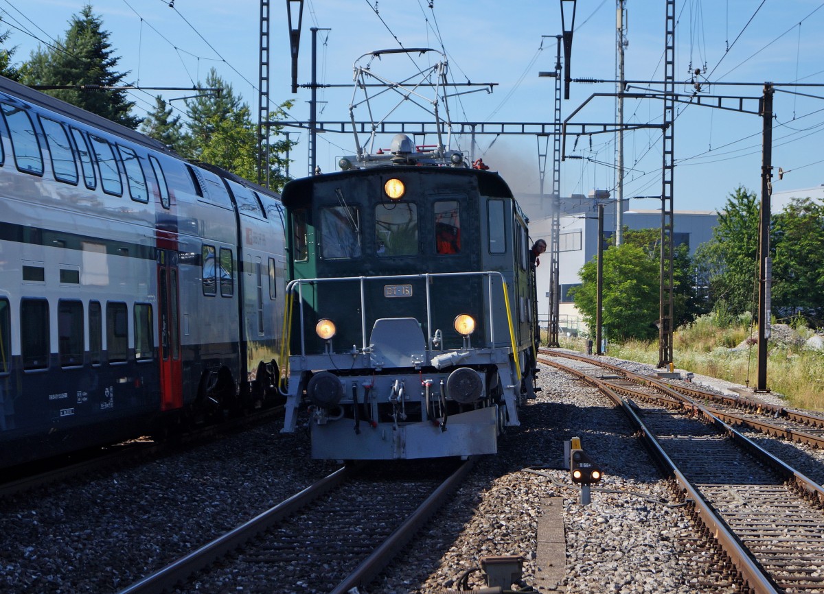 BDWM/DVZO/DBB: Ueber das Wochenende vom 26. bis 28. Juni 2015 verabschiedete sich die BDWM nach 140 Jahren vom Anschluss an das Europäische Normalspurnetz, weil durch die Aufhebung des Güterverkehrs auf normaler und schmaler Spur das Dreischienengeleise zwischen Wohlen und Bremgarten West nutzlos geworden ist. Mit dem WESCHTFÄSCHT und vielen Sonderfahrten nahmen Schüler und eine grosse Anzahl Festbesucher Abschied vom Dreischienengeleise auf diesem reizenden Streckenabschnitt. Am 26. Juni 2015 brachte die DVZO Be 4/4 15, ehemals BT die DBB Eb 3/5 5810  HABERSACK , ehemals SBB von Konolfingen nach Wohlen. Die Aufnahme dieser Ueberfuhr ist bei Herzogenbuchsee, leider auf dem nicht vorgesehenen Geleise entstanden.