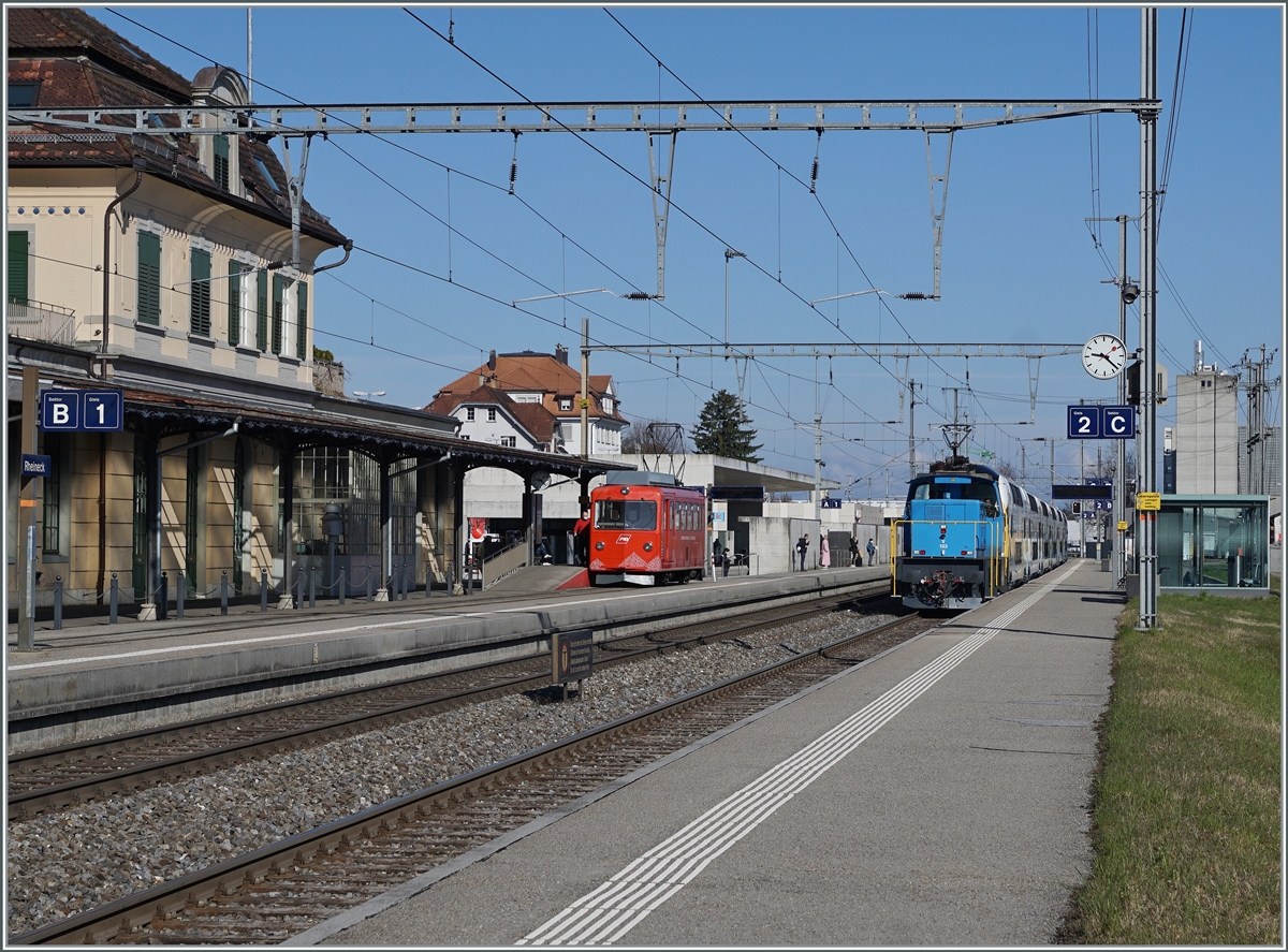 Während rechts im Bild der Stadler Eea 936 133-8 mit einem sechsteiligen Westbahn  Kiss 2  auf dem Weg in Richtung St. Margrethen in Rheineck durchfährt, wartet links im Bild der der AB RhW BDeh 1/2  auf die Abfahrt nach Walzenhausen. 23. März 2021