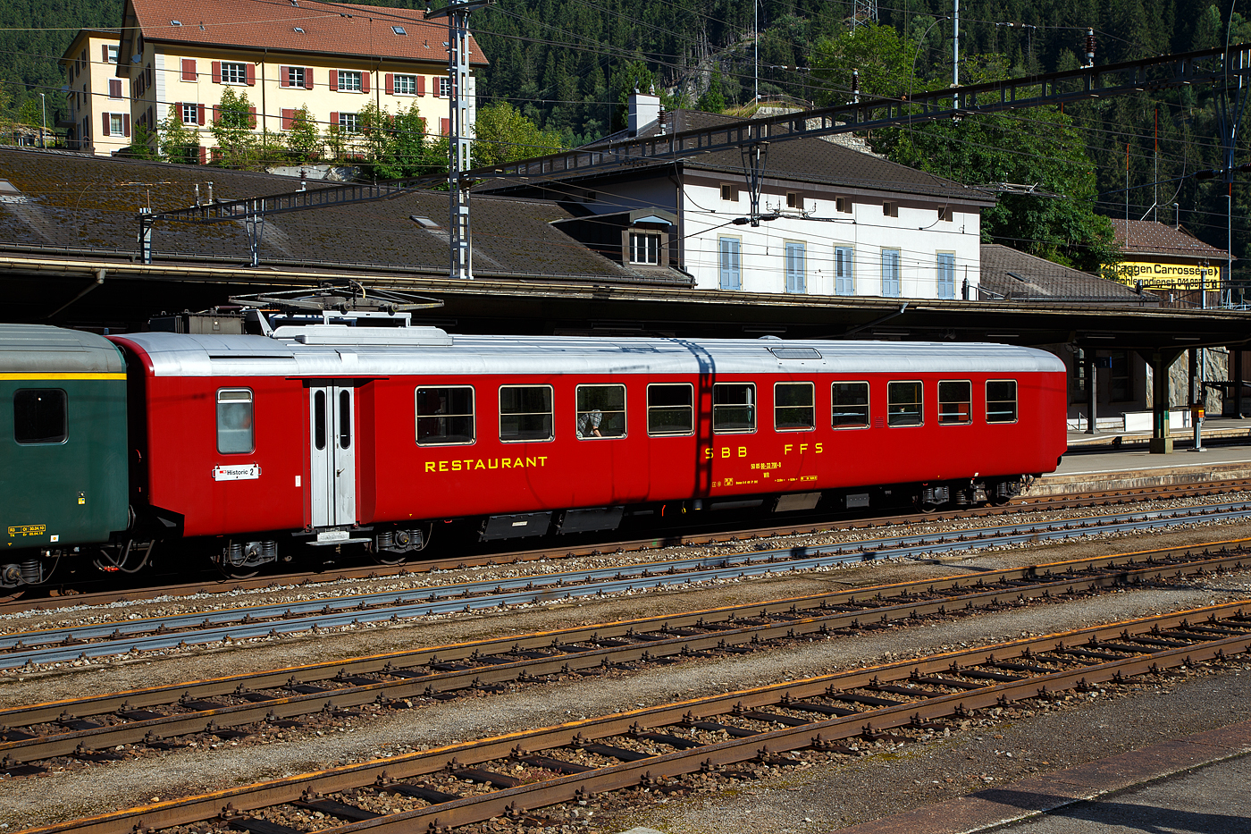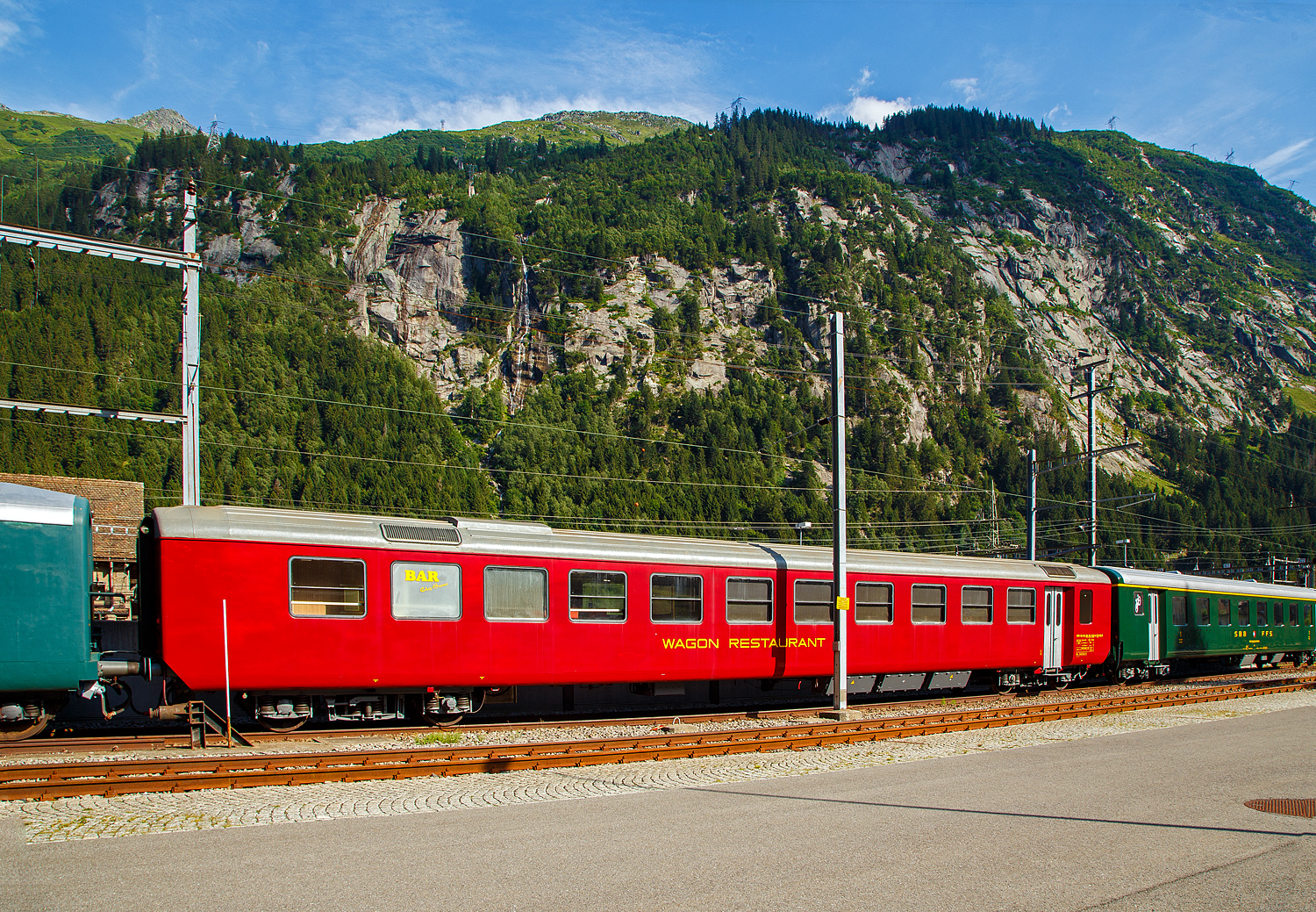 Eine SBB Re 8/8 in Form zwei gekuppelter Re II, die Re 4/4 11194 (Re 420 / 91 85 4 420 194-3 CH-SBB) und Re 4/4 11156 (Re 420 / 91 85 4 420 156-2 CH-SBB) hat am 02.08.2019 (leider bei Regen), mit dem Venice Simplon-Orient-Express (VSOE) nach Venedig, den Bahnhof Göschenen erreicht.