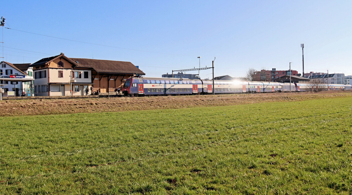 Die Kempttalbahn: Lok 450 053 stösst ihren S-Bahnzug nach Zürich Hardbrücke Richtung Pfäffikon ZH. Vor der Lok ein Doppelstockwagen Serie 26-73 aus der ab 2011 gebauten Serie von 113 Wagen "DPZ Plus" für die SBB. 5.März 2025 Peter Ackermann