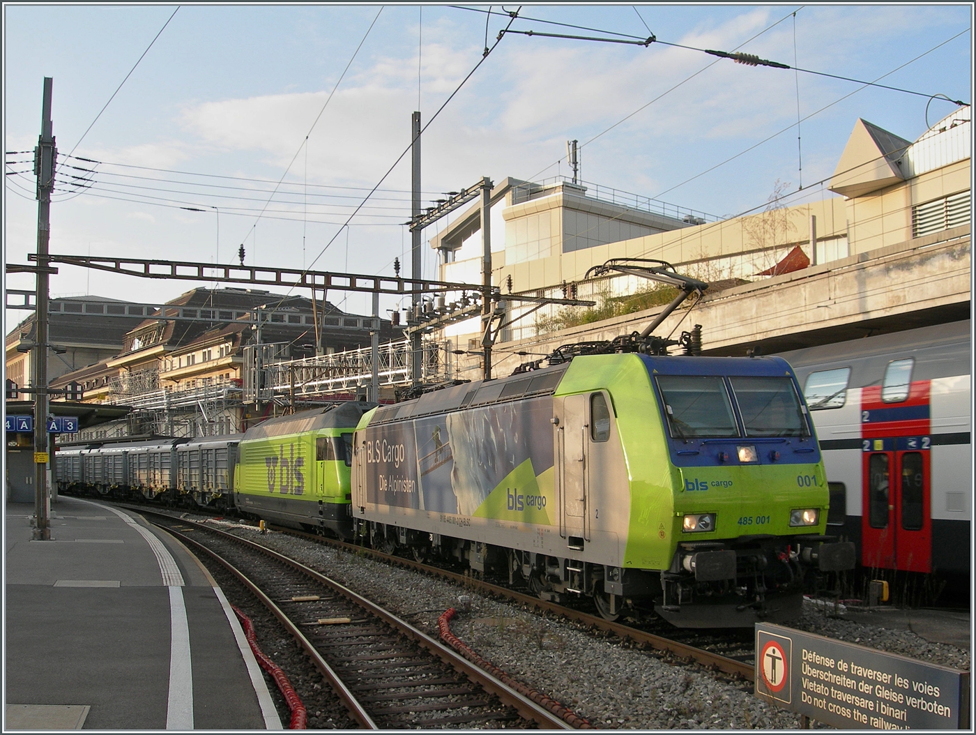 Zwei BLS Re 485 mit einer RoLa von Freiburg i.B. nach Novara bei der langsamen Durchfahrt (Spurwechsel) in Preglia.