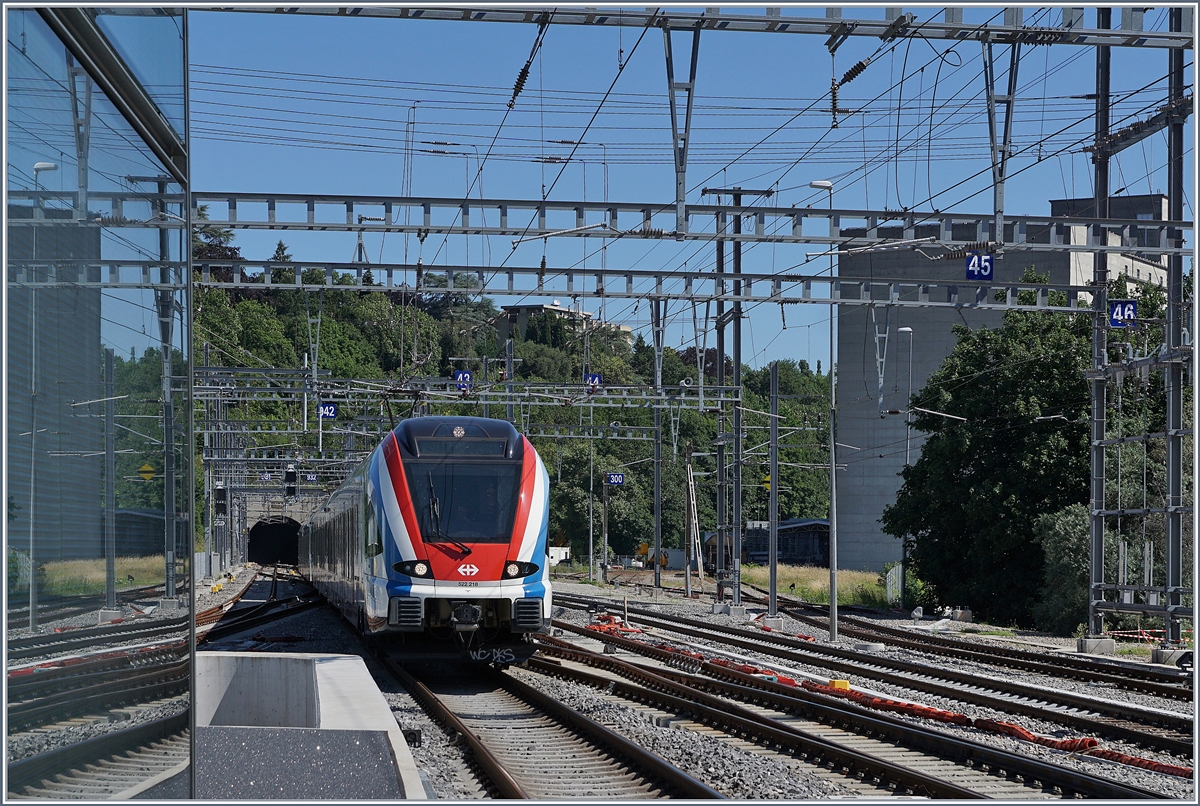Die Rail Care Rem 476 454 (UIC 91 85 4476 454-9 CH-RLC) ist nach der Fahrt nach Vufflens la Ville mit ihrem Coop-Container-Zug wieder zurück in Genève, hier erreicht der Zug bei Lancy Pont-Rouge den Güterbahnhof Genève La Praille. 19. Juni 2018