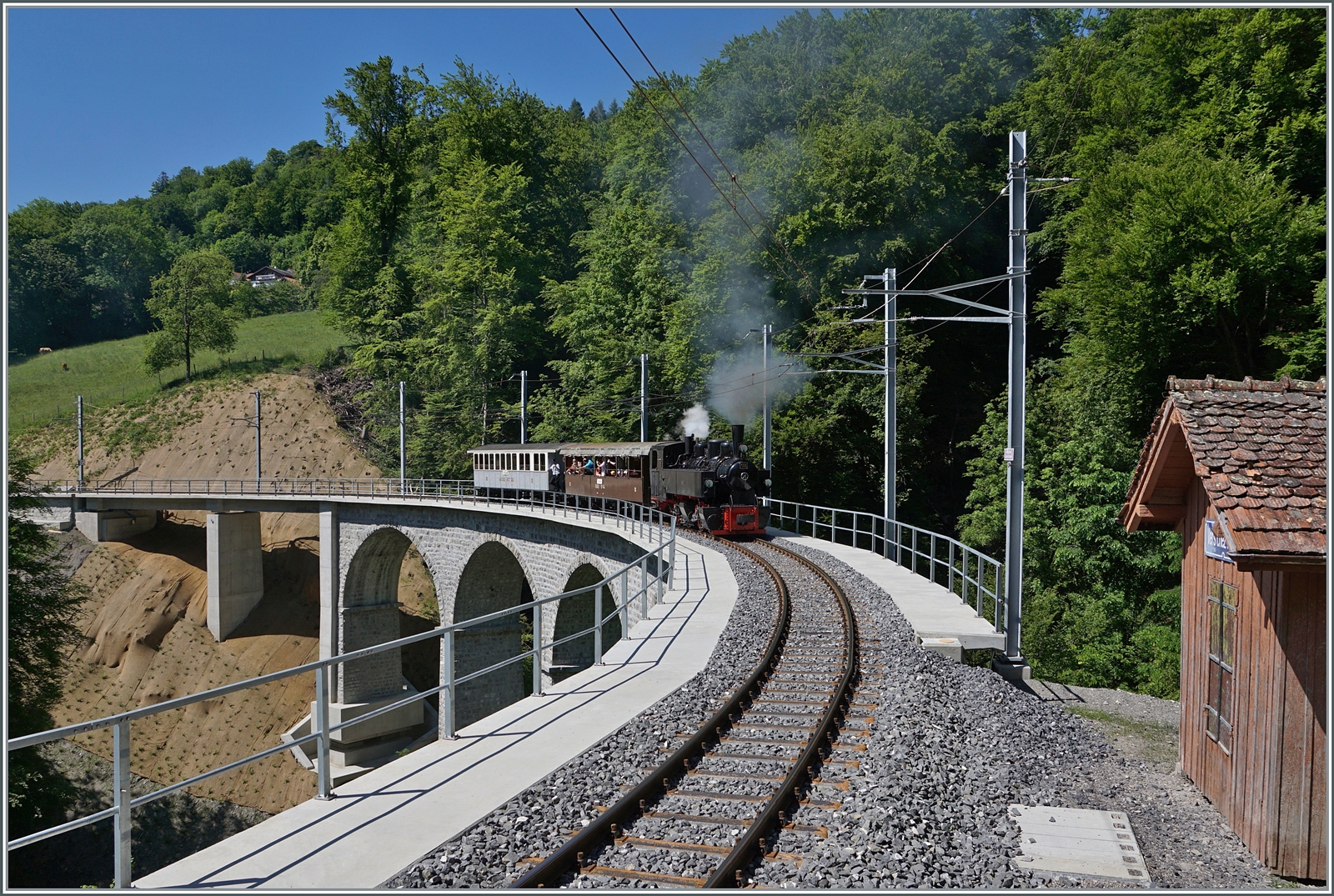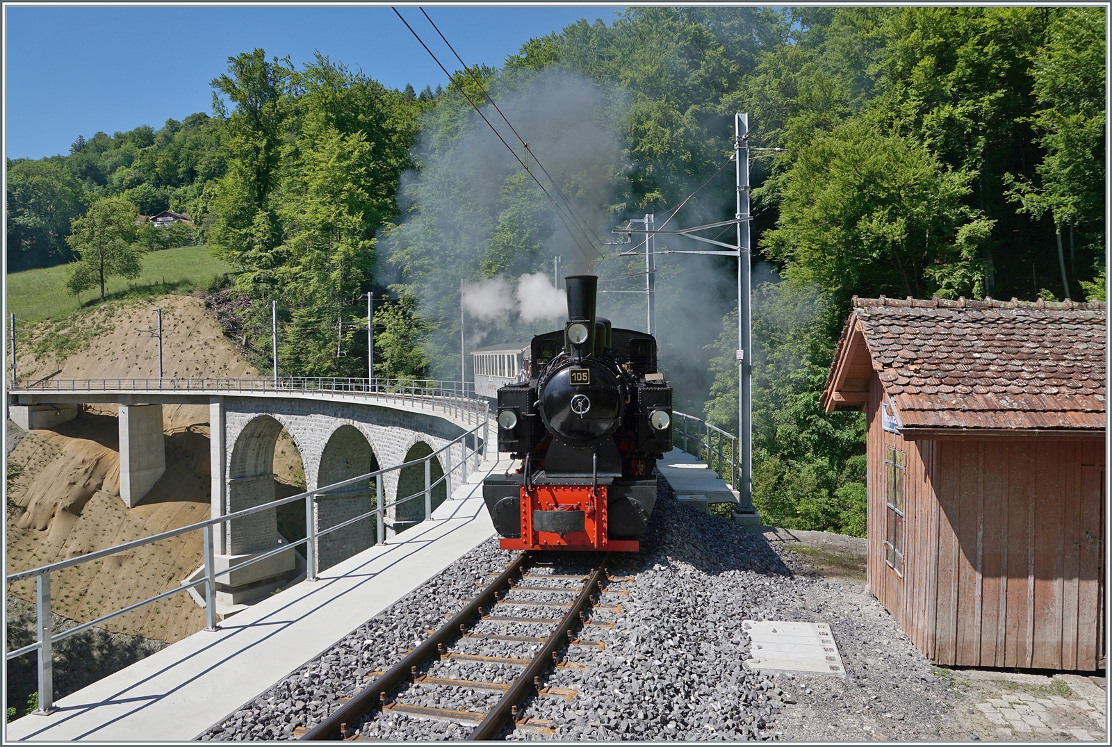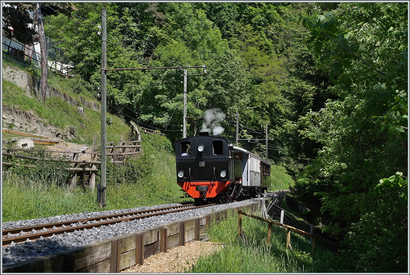 Der Bernina Bahn ABe 4/4 35 ist imt dem TrB Wassersprengwagen Xe 2/2 N° 1 als Löschzug auf dem Baye de Clarens Viadukt unterwegs.