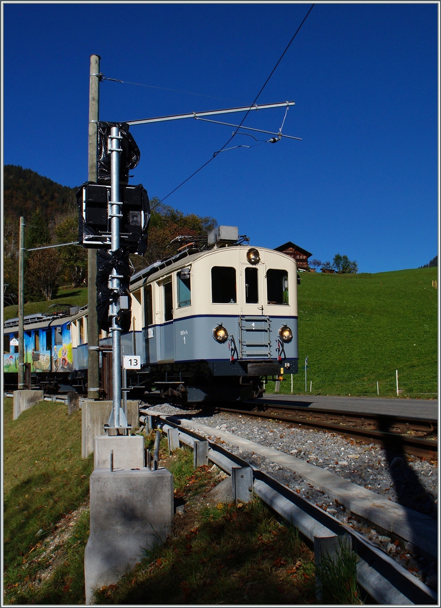 Danke der kleinen Reisegruppe die irrtümlich beim Bedarfshalt Les Planches ausstieg und somit den Zug zum Halten veranlasste, kam ich in den Genuss die BDe 4/4 404, Bt und BDe 4/4 401 beim Halt fotografieren zu können.