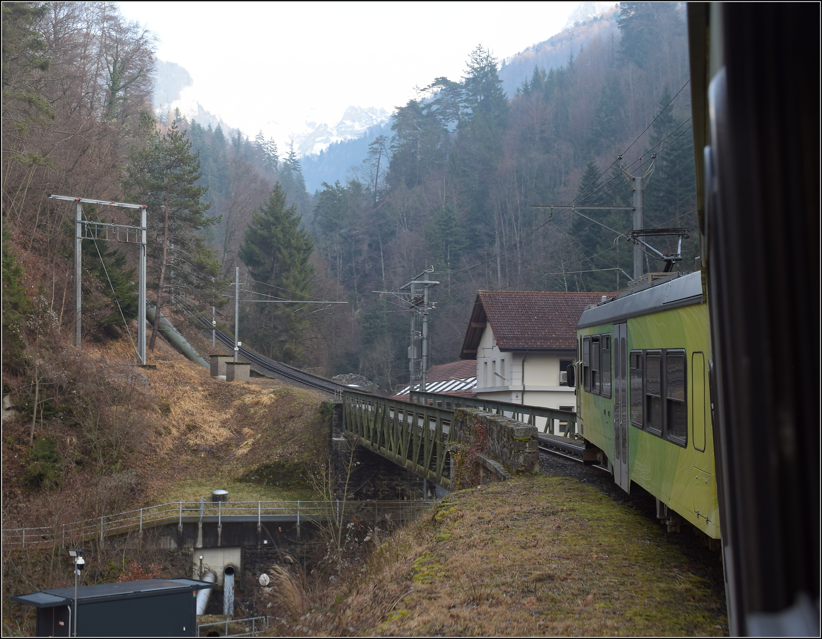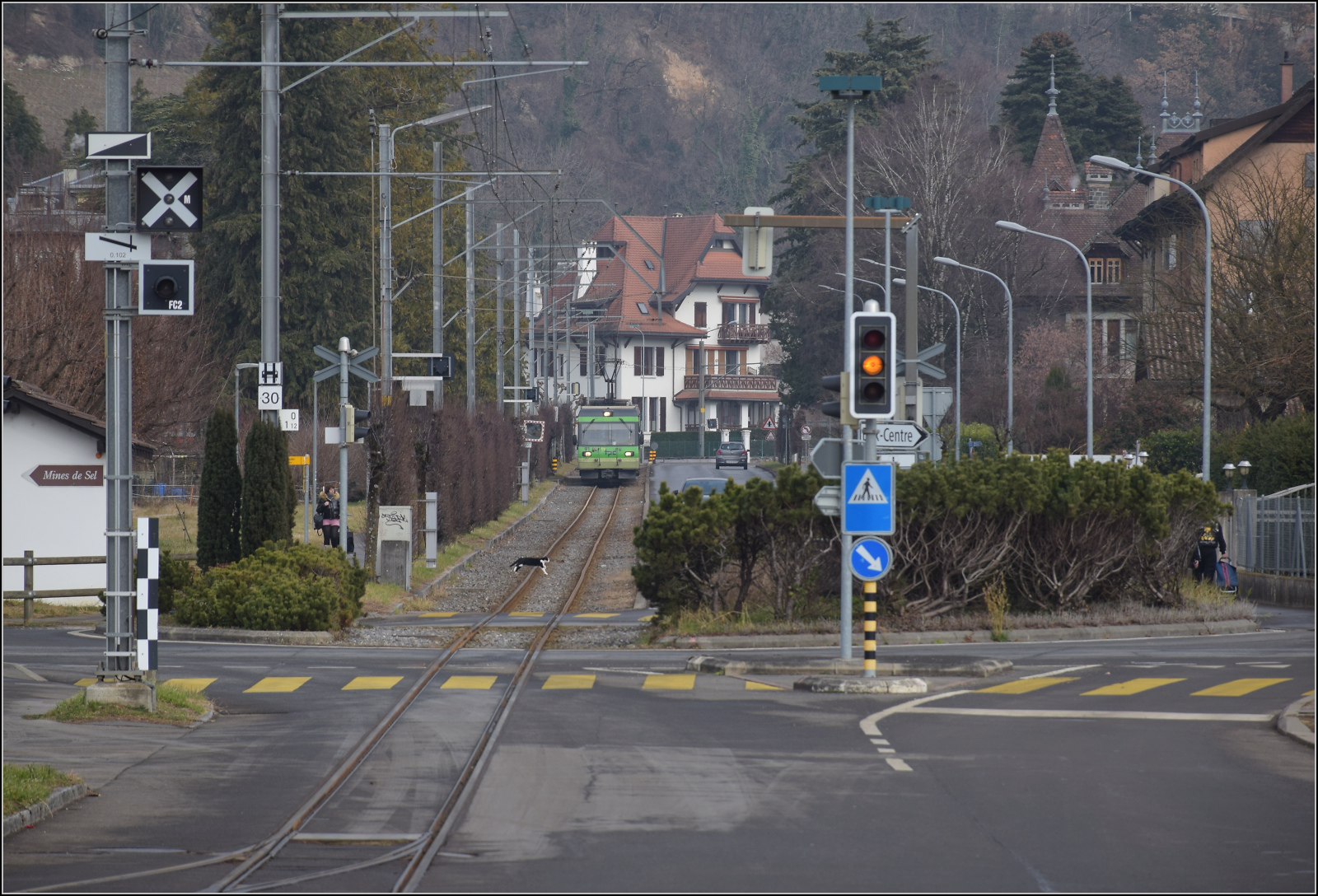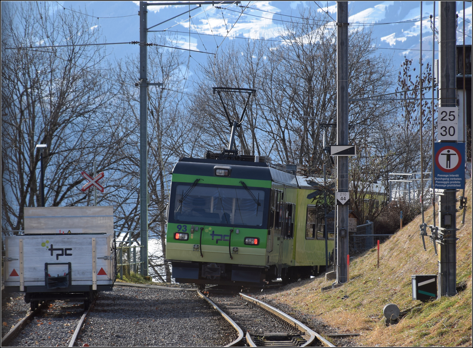 Der BVB Beh 4/8 93 verlässt als Regionalzug 23 von Villars-sur-Ollon nach Bex den Bahnhof Gryon. Auf einem Abstellgleis steht der Xeh 2/4 26