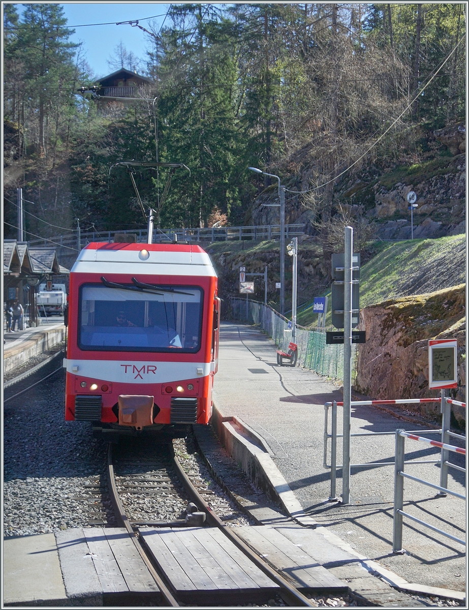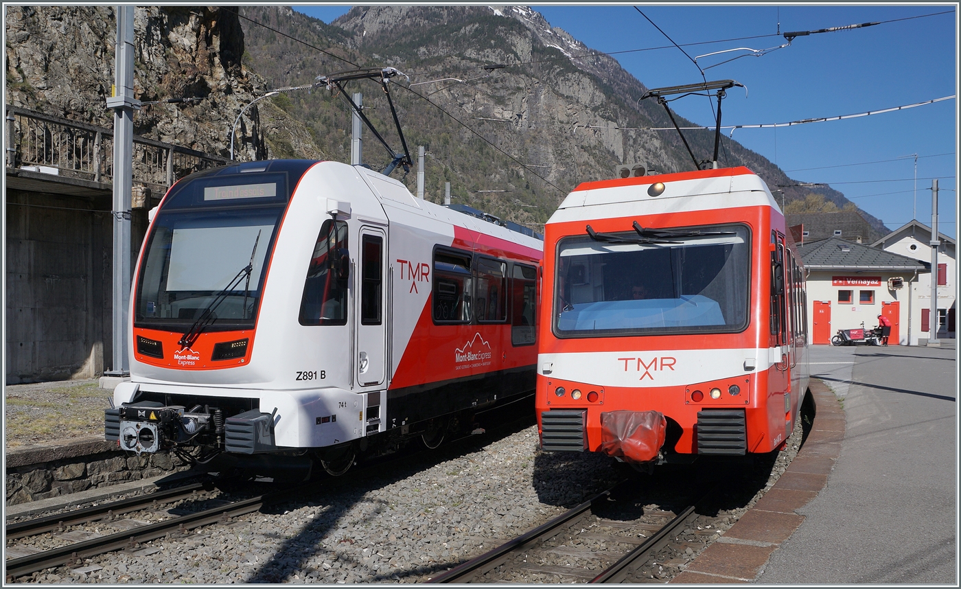 In Vernayaz M-C begegnet der TMR Beh 4/8 72 (UIC 90 85 838 072-4 CH-TMRSA) dem neuen TMR/SNCF Beh 4/8 (90 85 838 0891-4). Während letzterer als Regionalzug 18977 auf dem Weg von Vallorcine nach Martigny ist, werden mit dem neuen Beh 4/8 91 Testfahrten zwischen Vernayaz MC und Martigny unternommen.
